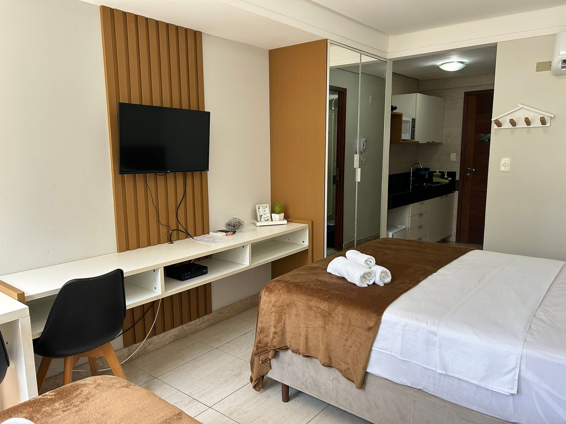 O flat é mobiliado, decorado e equipado com eletrodomésticos e utensílios para preparo de refeições, além de dispor de enxoval completo de lençóis, toalhas e travesseiros para a sua entrada.