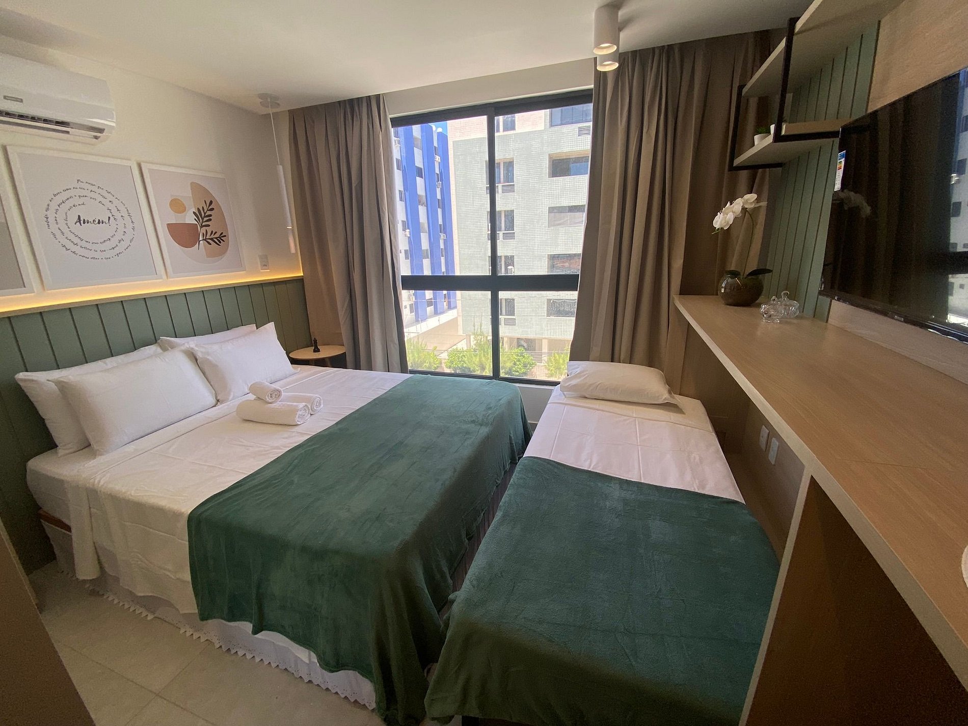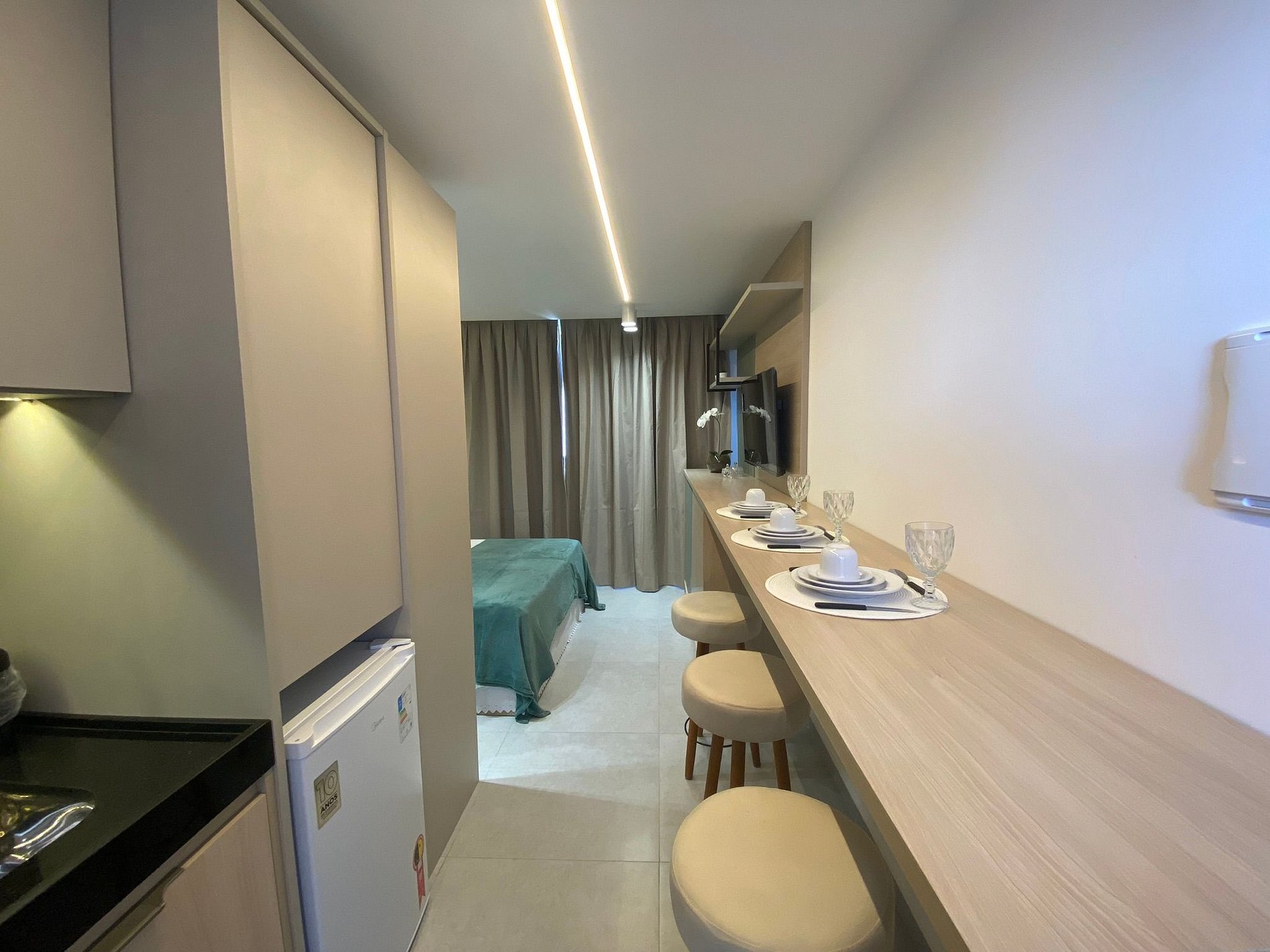 Flat com ar condicionado, Smart TV( possui canais por streaming), wi-fi 300Mega, cama Queen + 01 cama solteiro, guarda roupa com cabides, cozinha totalmente equipada com frigobar, cooktop 02 bocas e microondas, espaço com banquetas para para refeições. Banheiro com chuveiro elétrico, secador de cabelo, armário e espelho.
