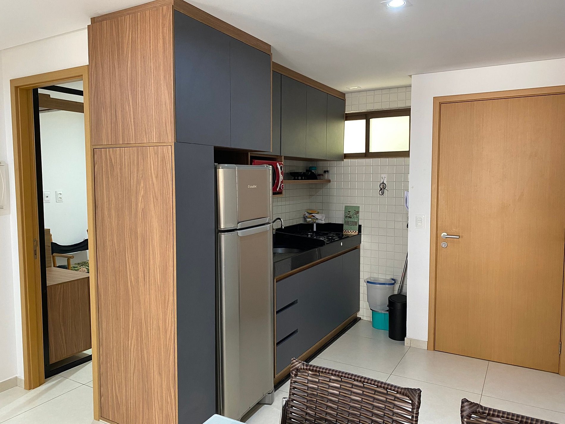 Possui cozinha equipada com micro-ondas, liquidificador, geladeira, cooktop, louças e talheres.