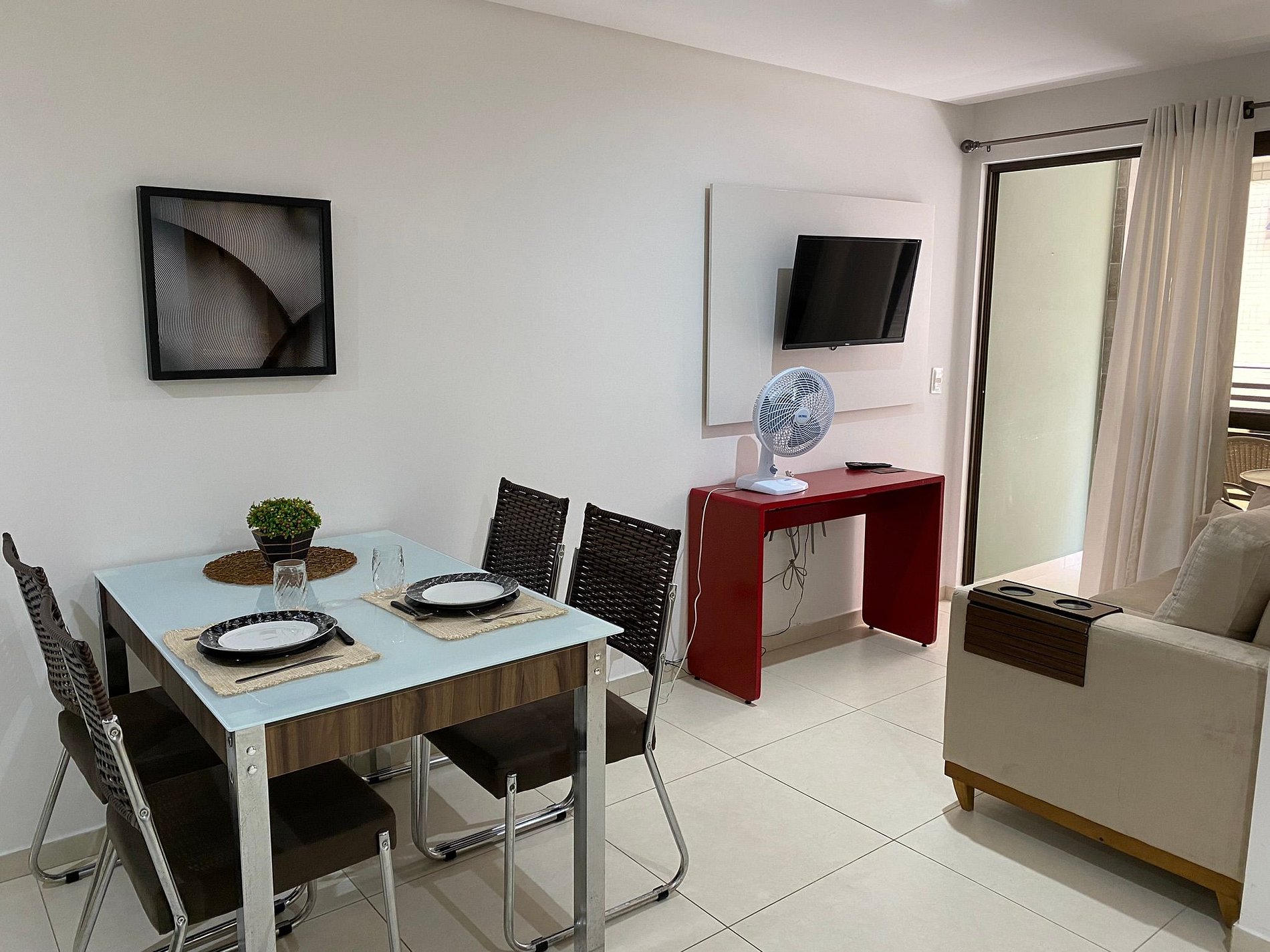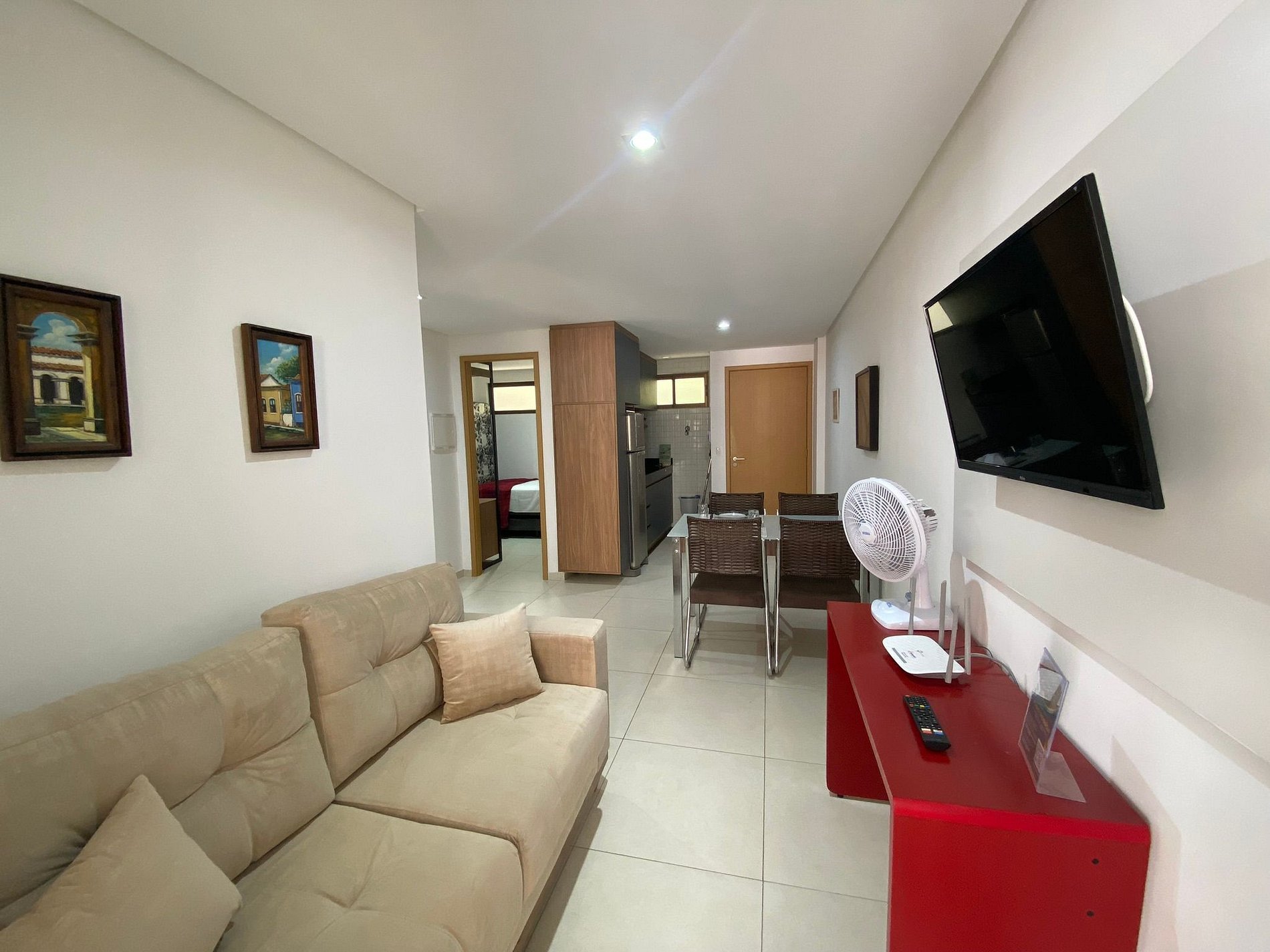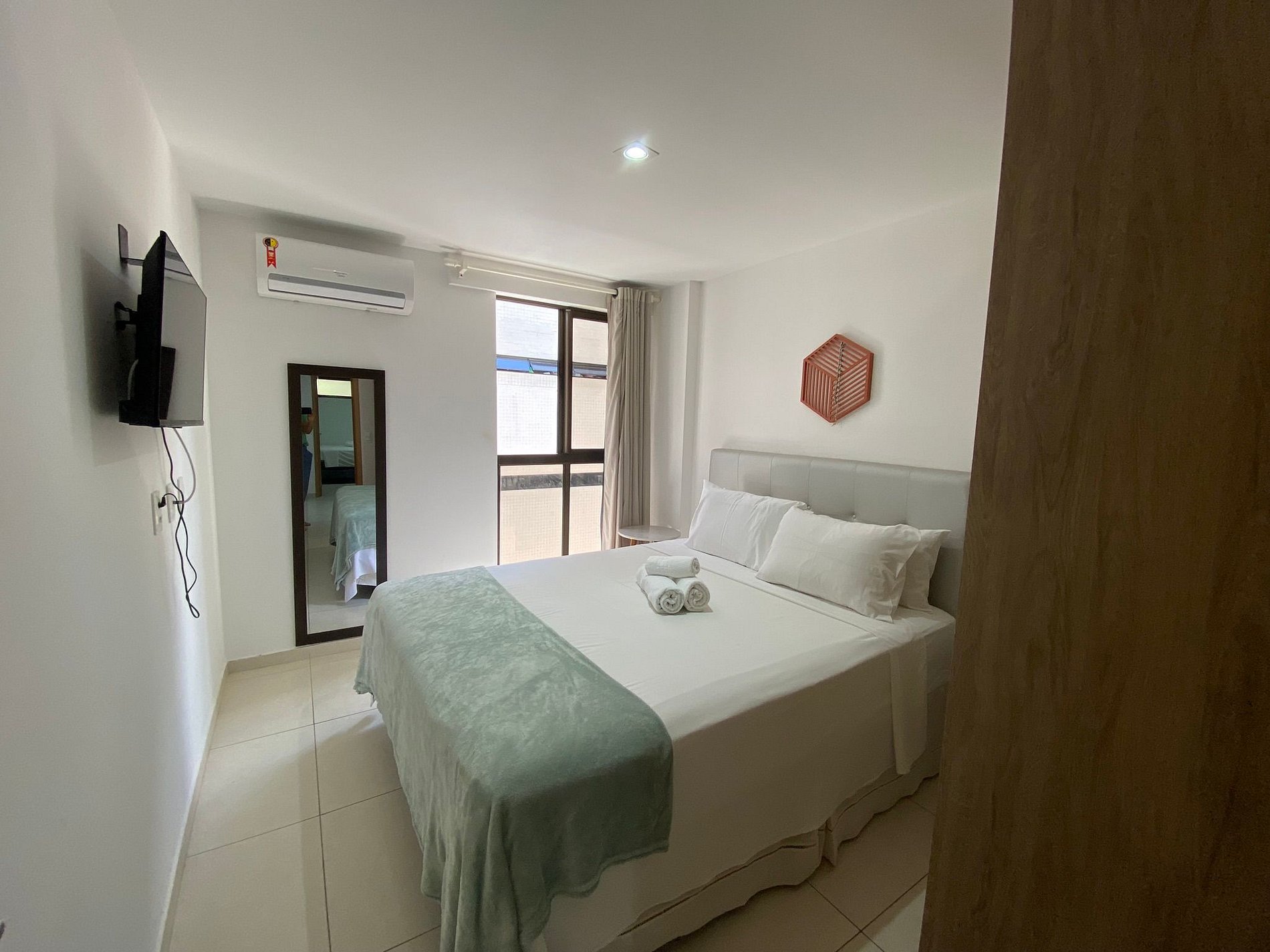 O flat possui sala, cozinha integrada, varanda, banheiro social e 02 quartos com ar-condicionado, equipados com cama de casal e bicama solteiro+ 01 colchão extra.