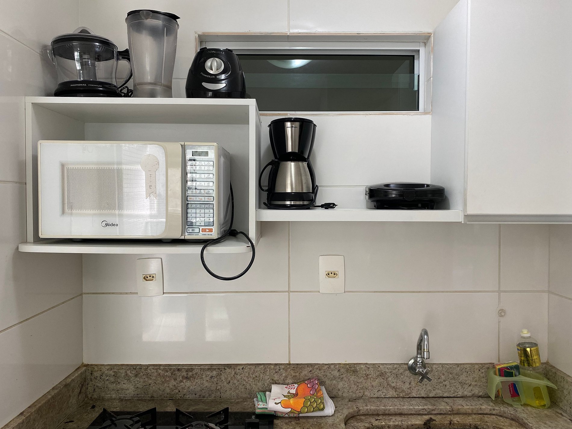 Sala com sofá cama, ar-condicionado e tv.. A cozinha compacta está equipada com frigobar, microondas, cooktop duas bocas, sanduicheira e liquidificador. Banheiro com chuveiro elétrico, ducha higiênica, armário e espelho.