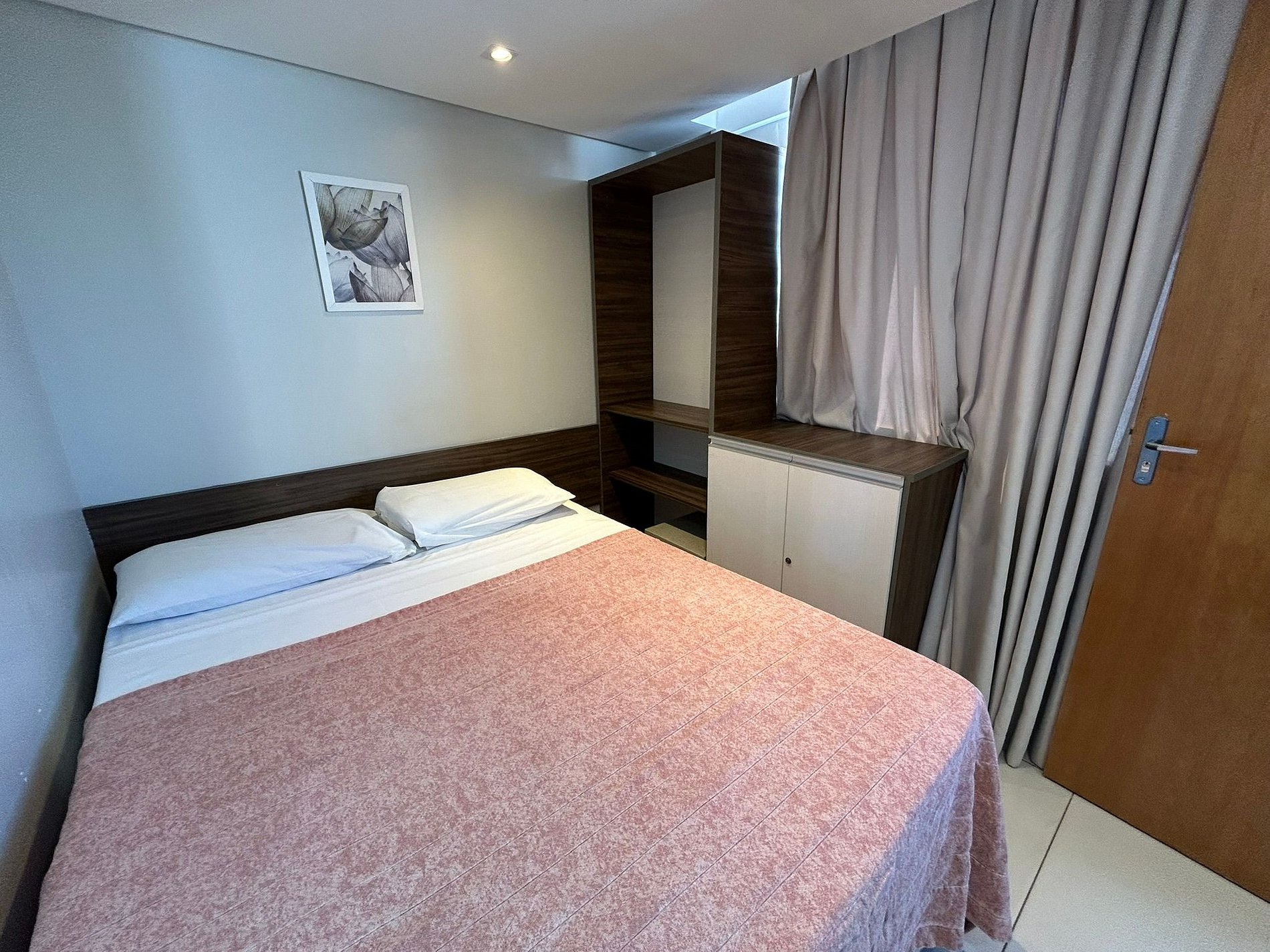 Possui smart TV, ar-condicionado central, cozinha compacta com eletrodomésticos e utensílios básicos (ideal para preparar pequenas refeições), closet com cabides, mesa de cabeceira, mesa de trabalho com cadeira.