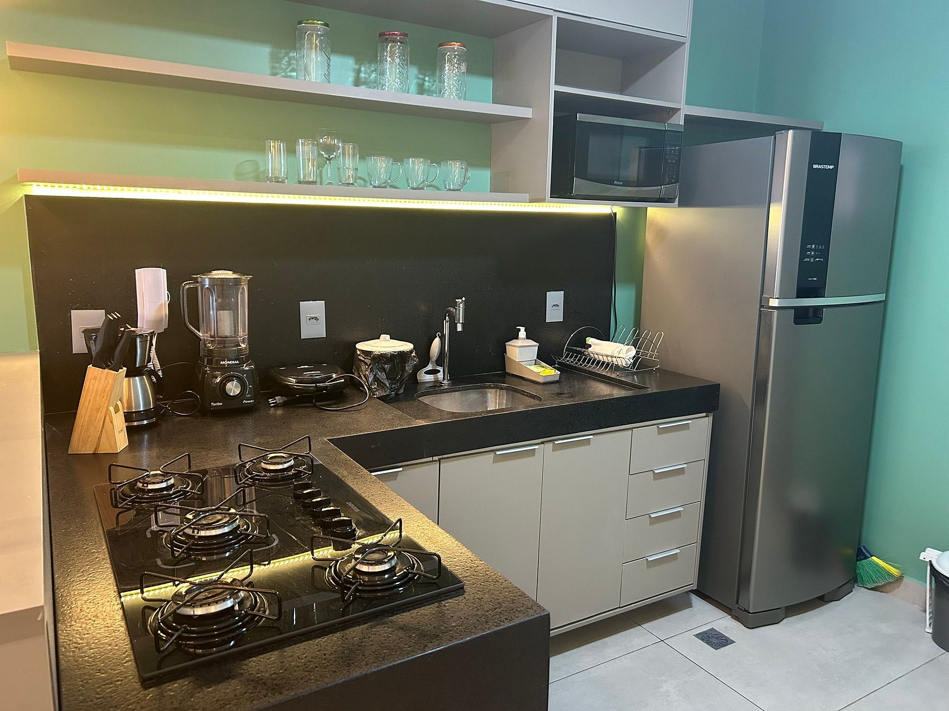 Cozinha equipada com os principais eletrodomésticos: cooktop, forno elétrico, geladeira duplex, microondas, liquidificador e demais utensílios.