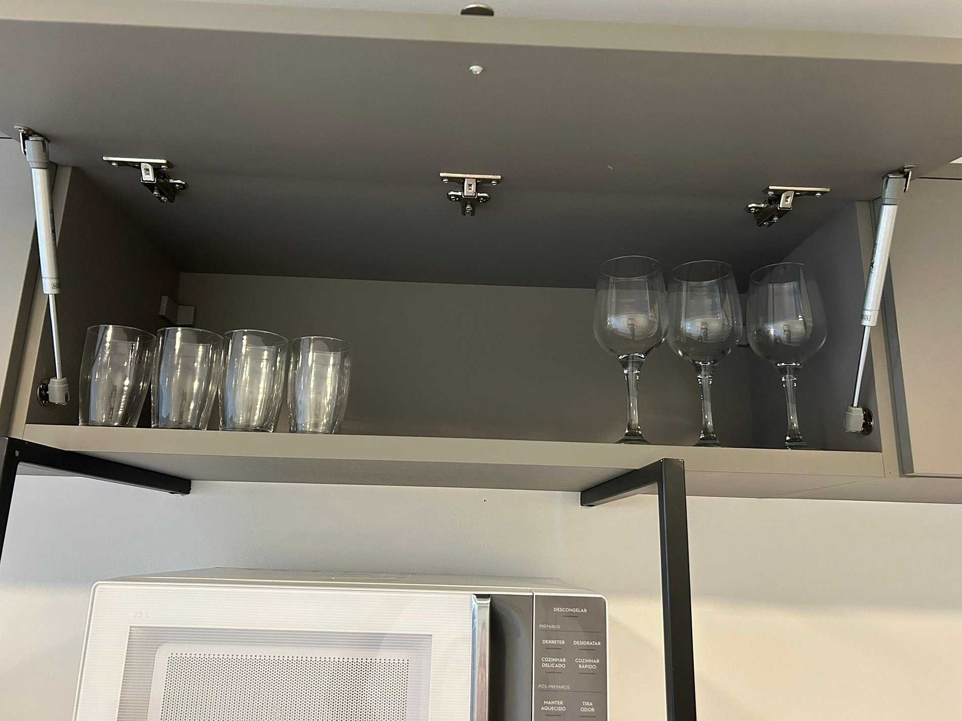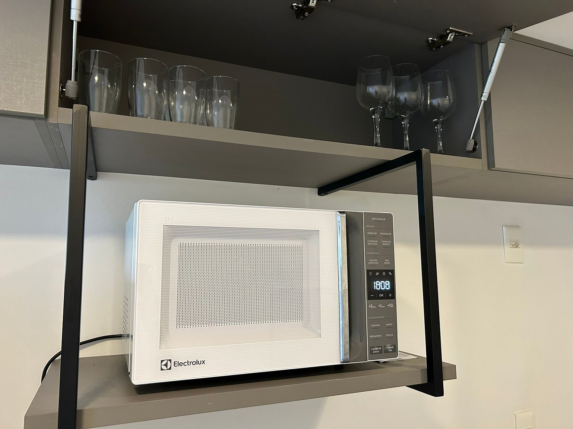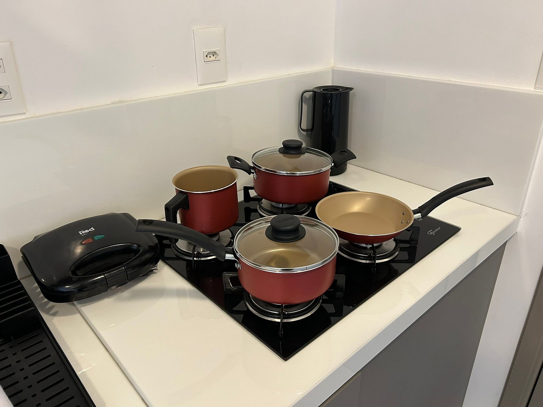 Cozinha compacta equipada com geladeira, fogão 04 bocas, microondas, panelas, pratos e talheres.