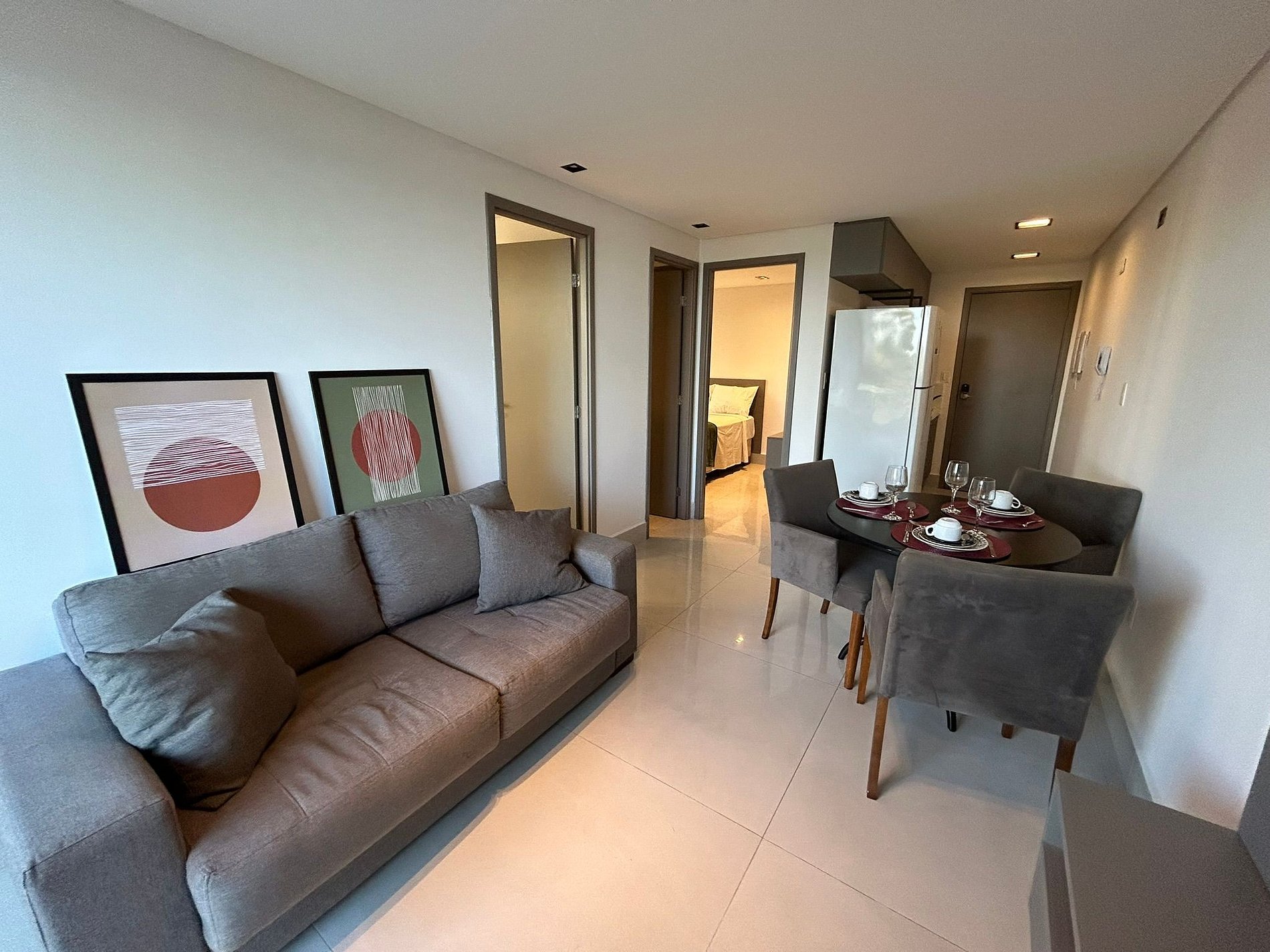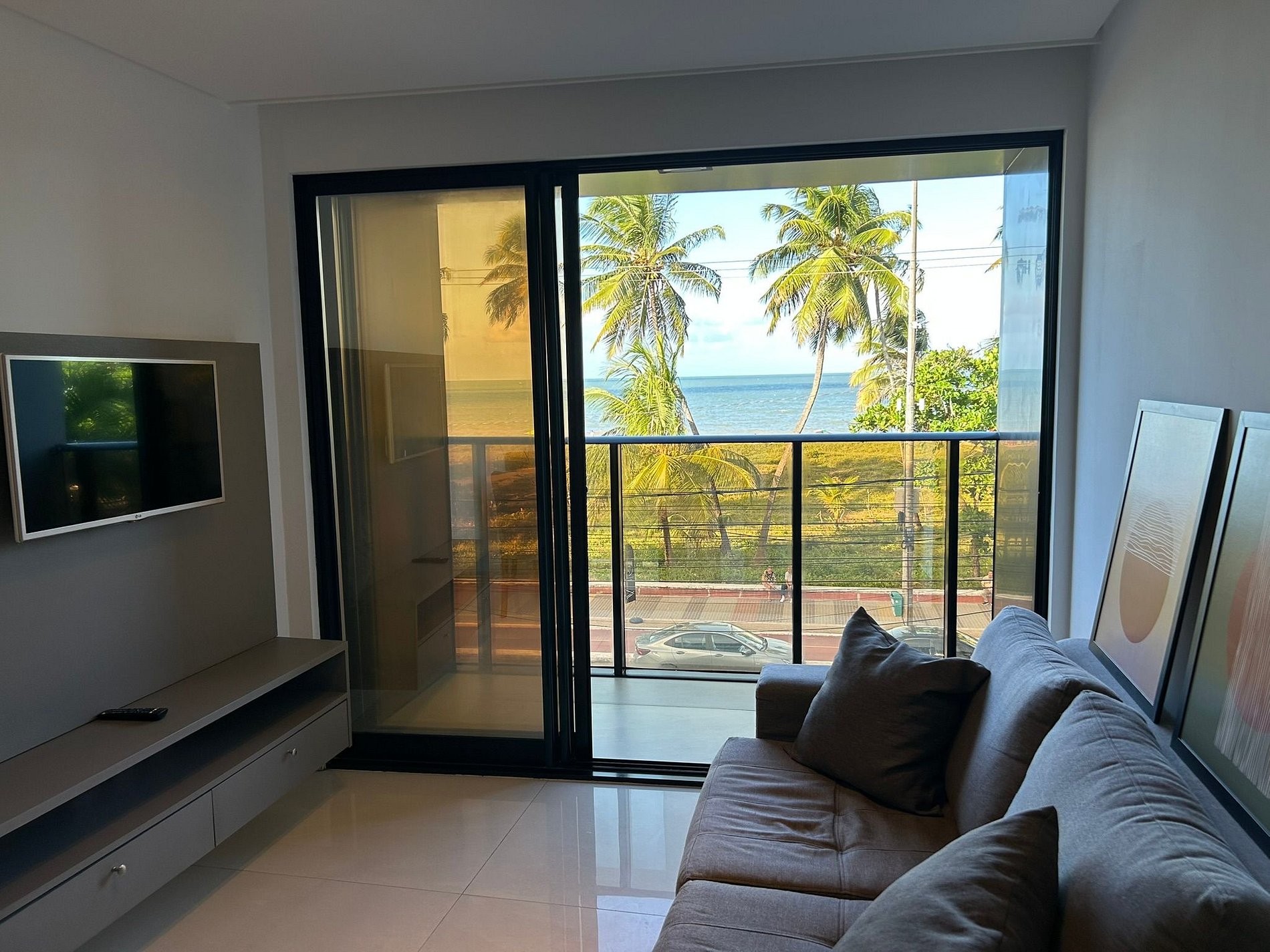 Em localização privilegiada, frente mar de Cabo Branco, o lindo flat possui varanda, dois quartos, cozinha compacta equipada, sala com tv Smart e sofá.