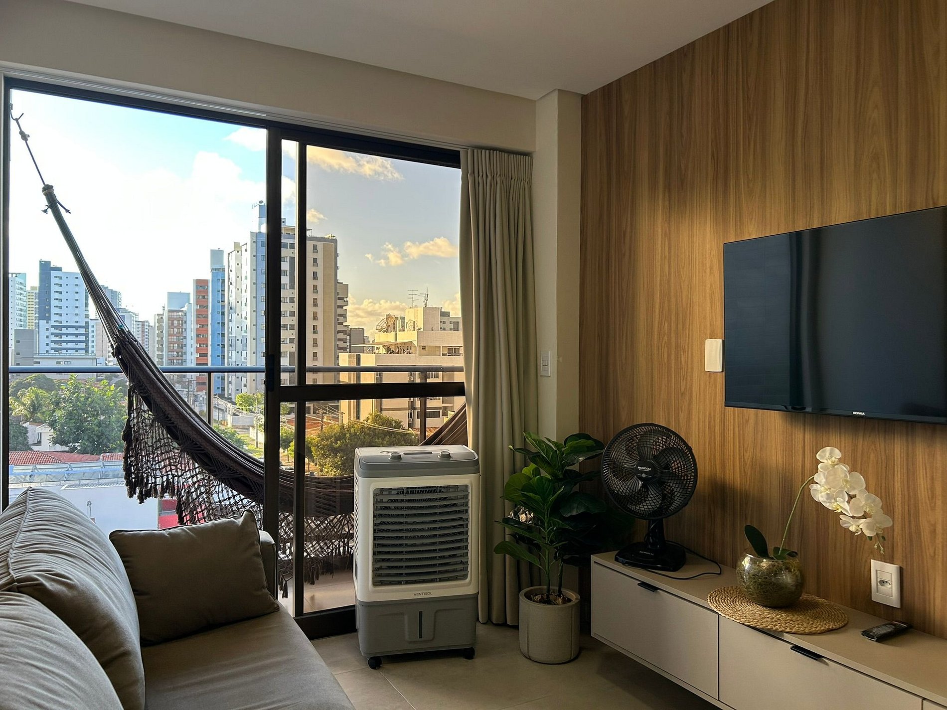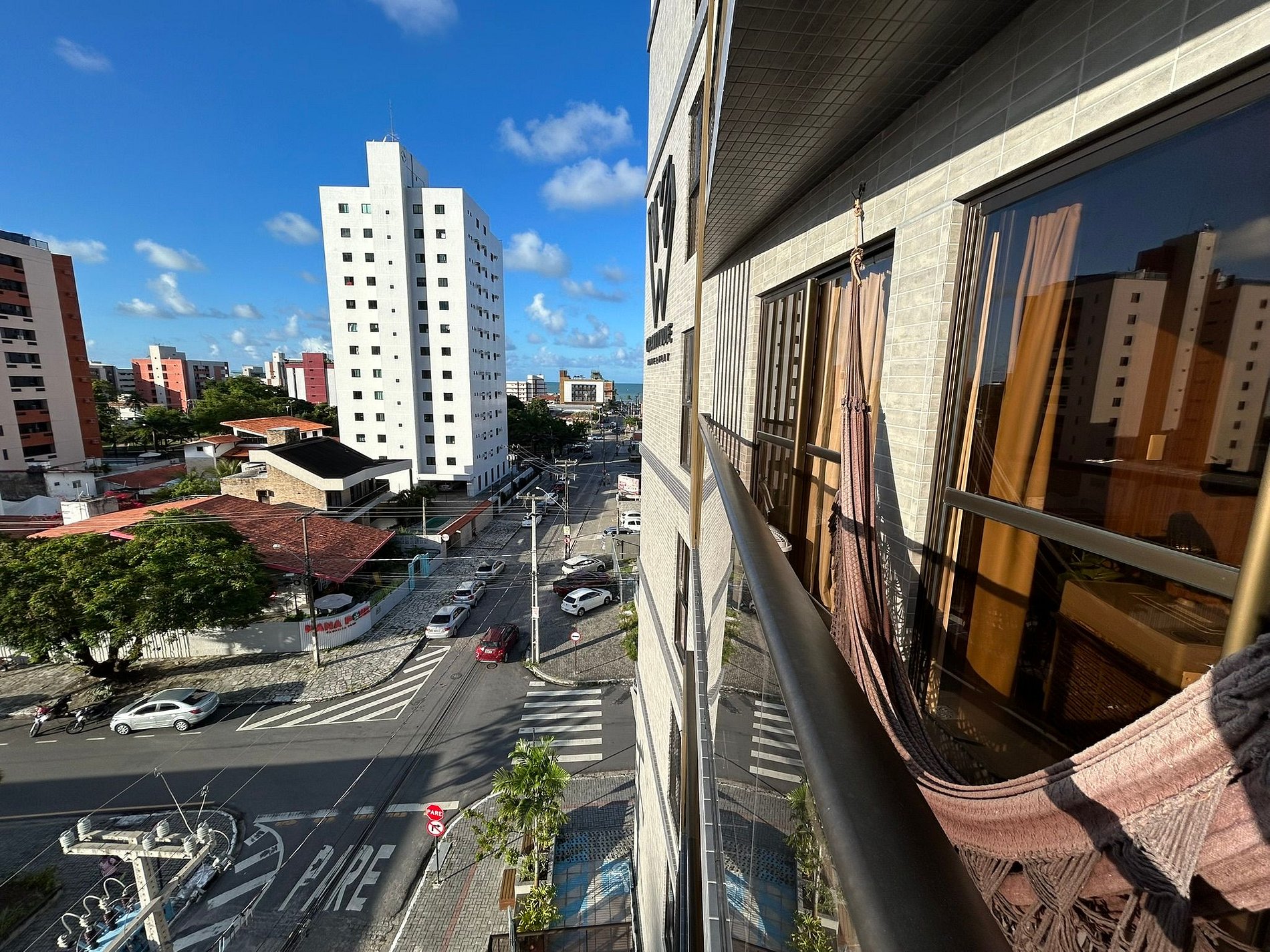 Flat de 60m² em Manaíra, com dois quartos com cama de casal, dois banheiros, cozinha completa e varanda com rede e vista parcial do mar. Localização privilegiada, próximo a bares, restaurantes, supermercados e comércios locais, ideal para quem busca conforto e praticidade.
