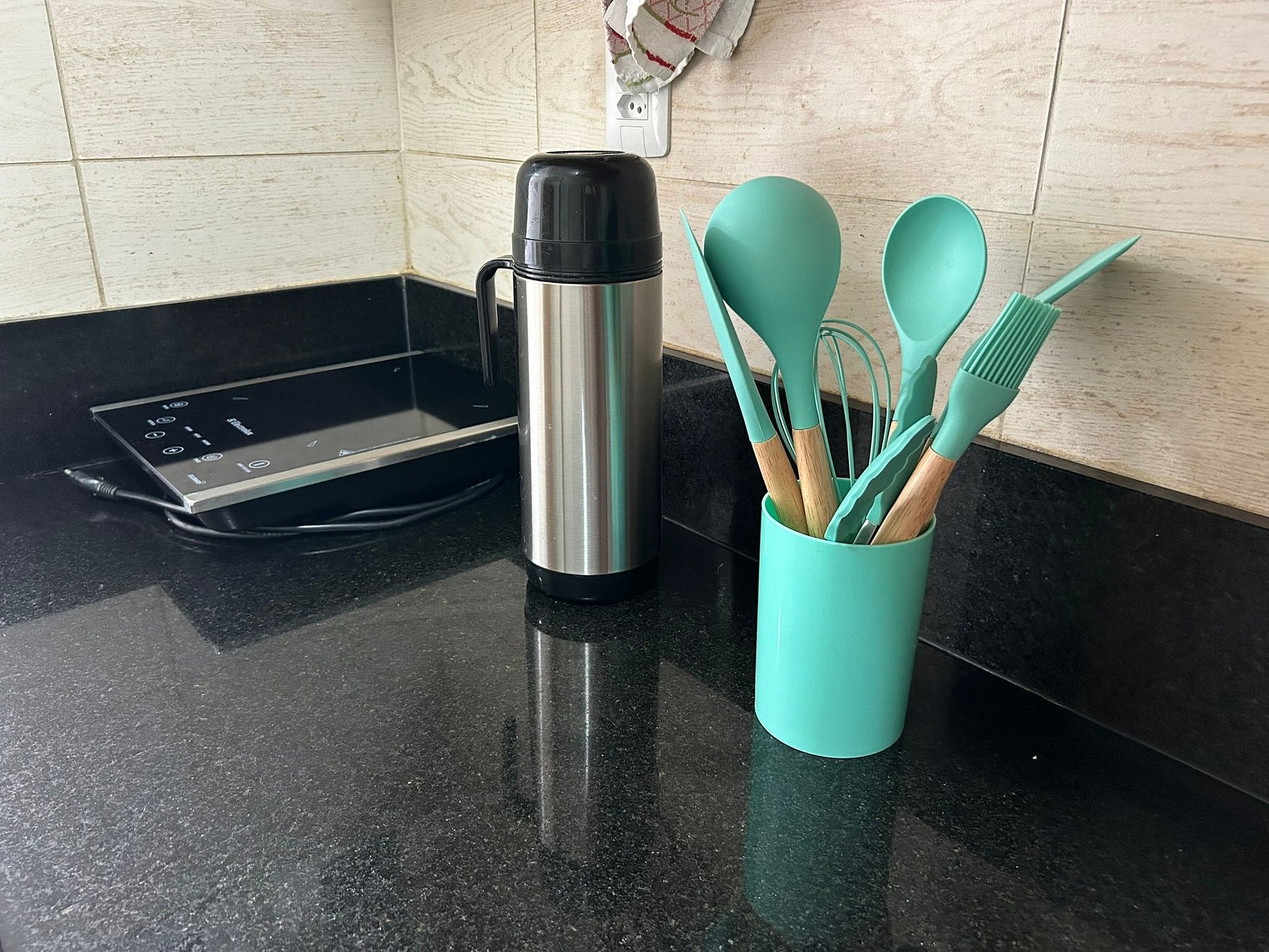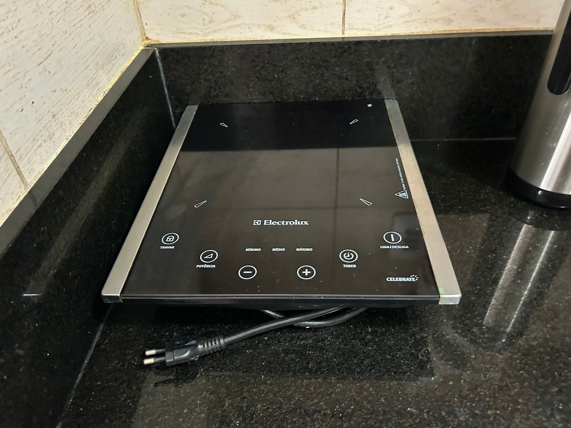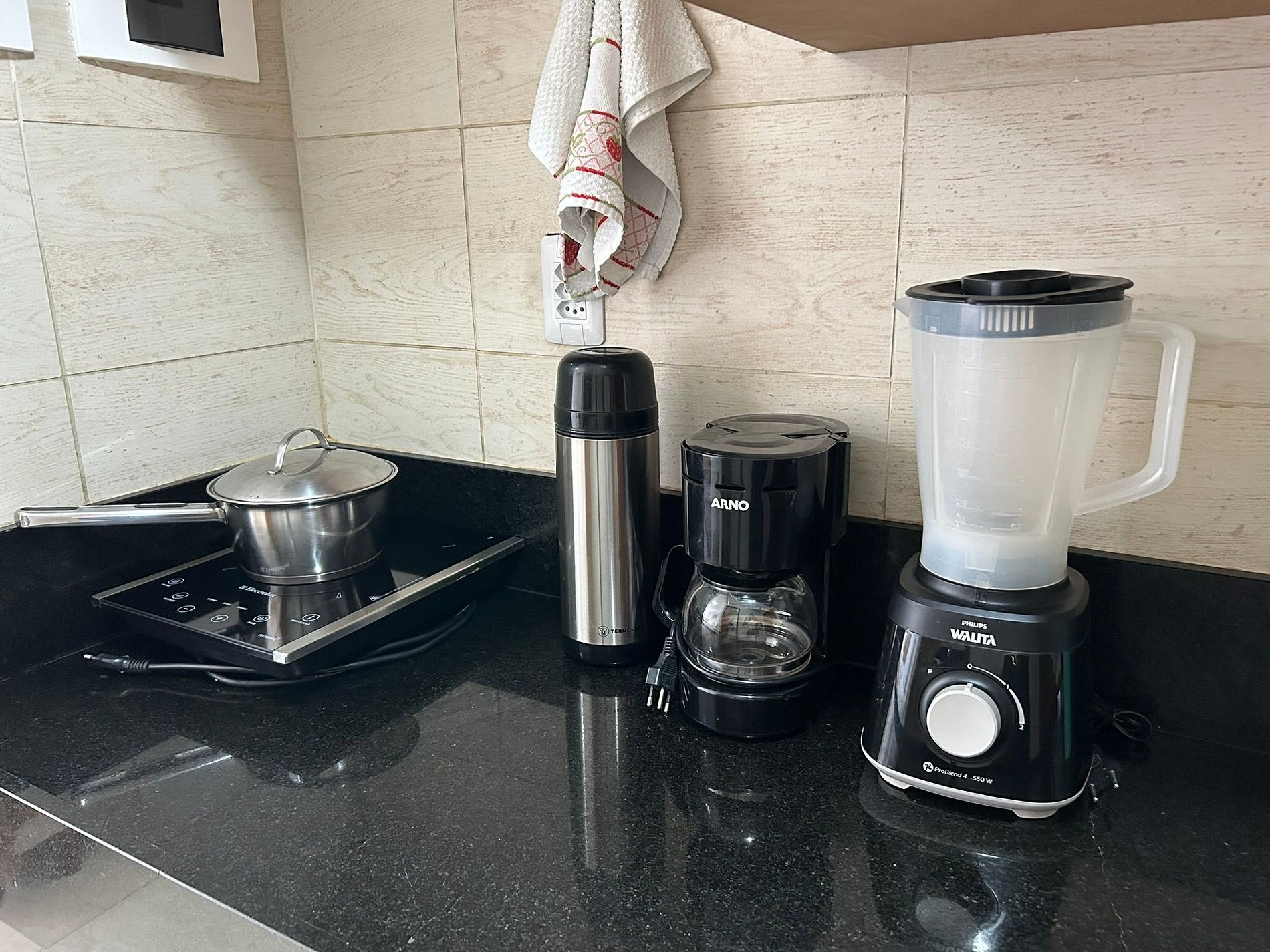 Possui cozinha compacta equipada com eletrodomésticos e utensílios básicos como frigobar, liquidificador, sanduicheira, cafeteira elétrica , microondas e fogão elétrico 01 boca,