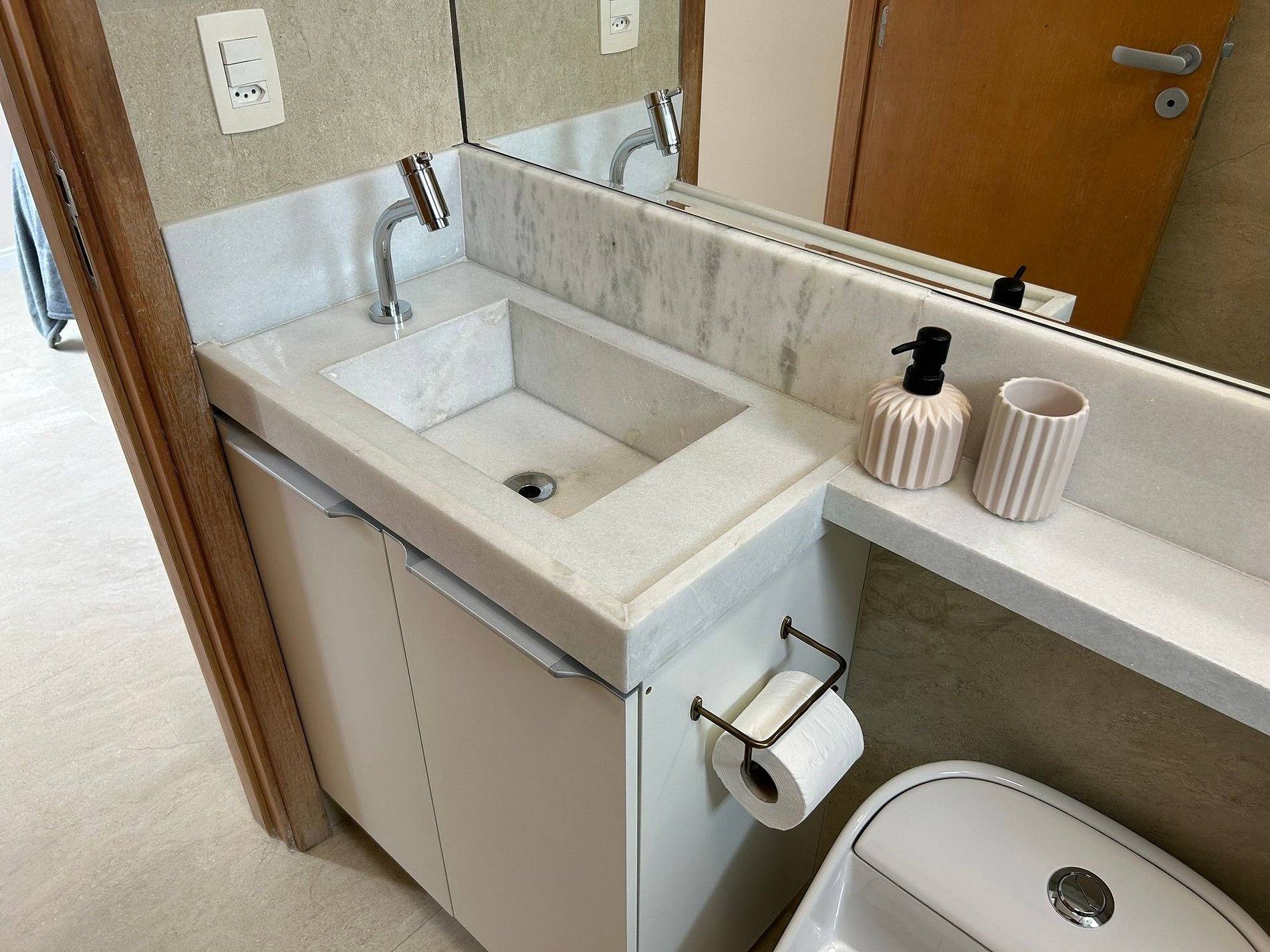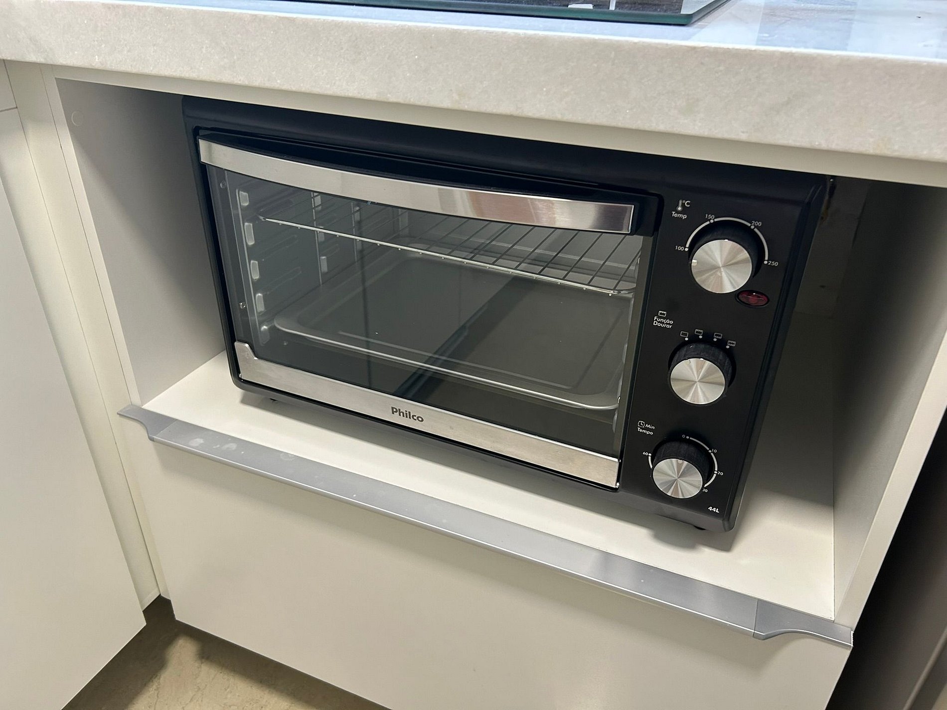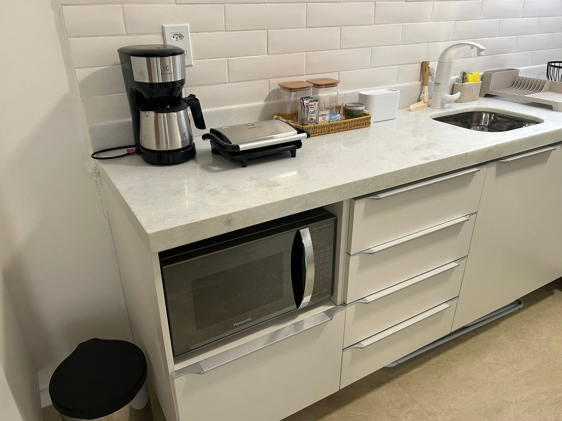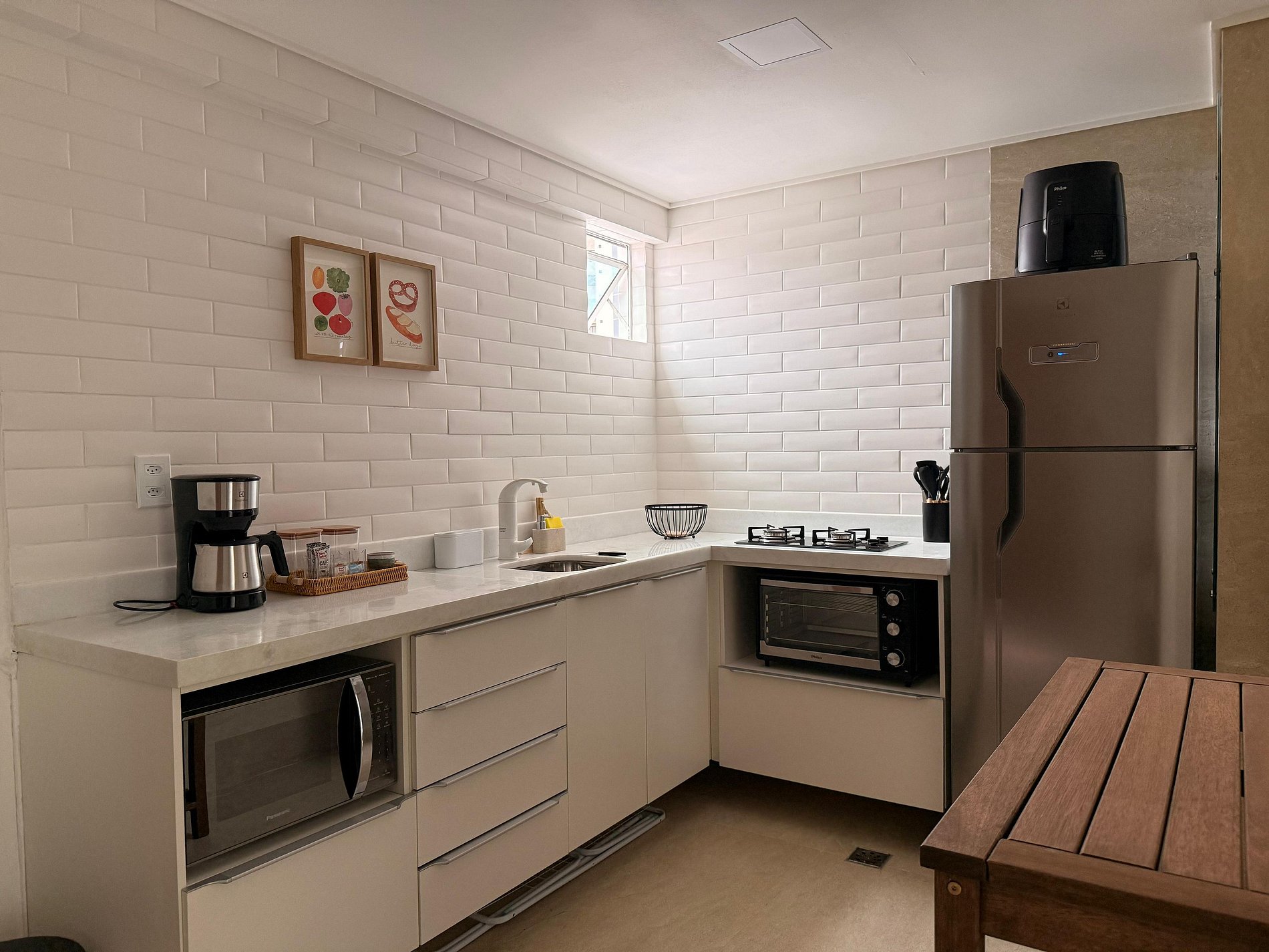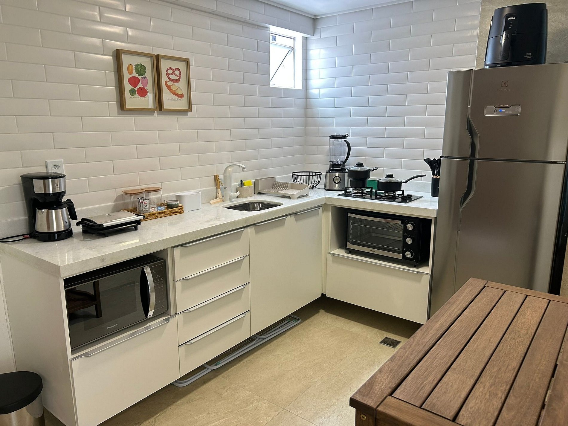 ● Cozinha americana equipada: cooktop, micro-ondas, airfryer, geladeira, cafeteira italiana, cafeteira elétrica, filtro de água, liquidificador, sanduicheira, panelas e utensílios