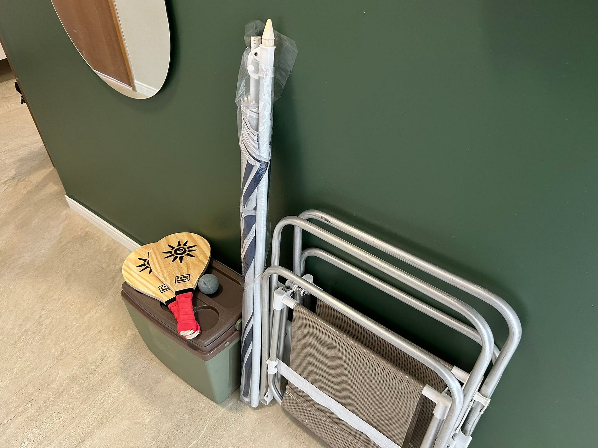 ● Ferro, tábua de passar, cadeiras de praia, guarda-sol e cooler