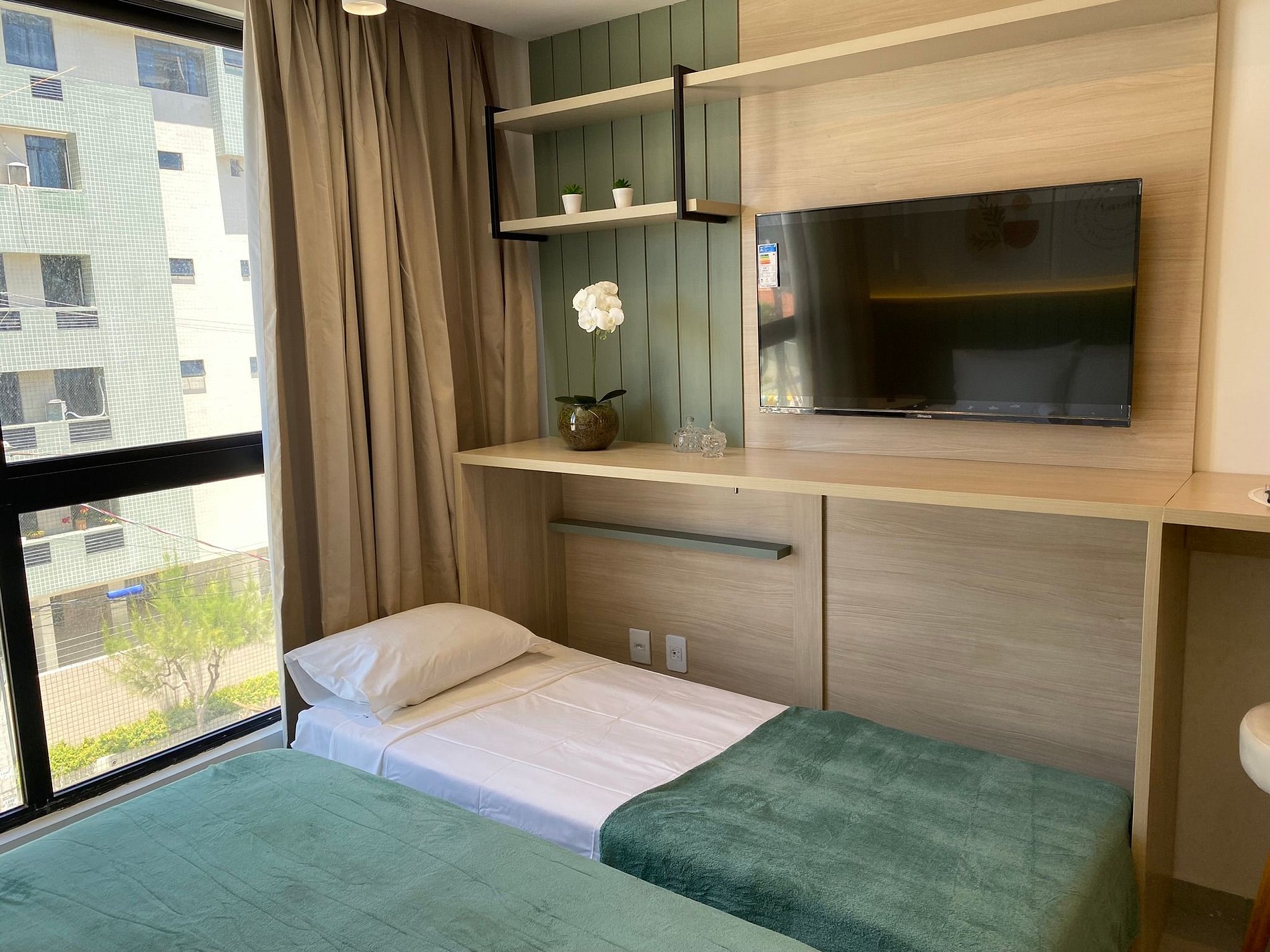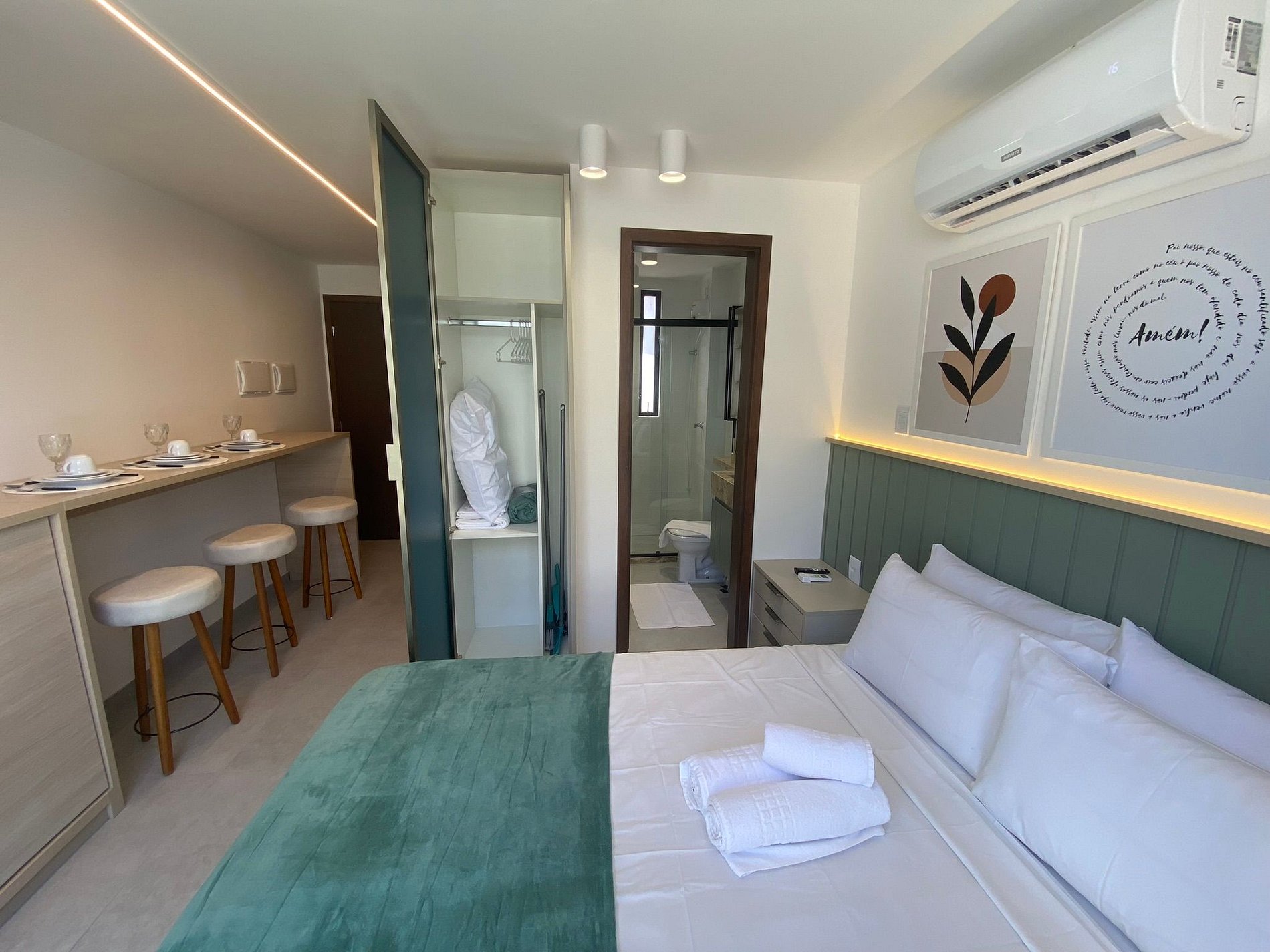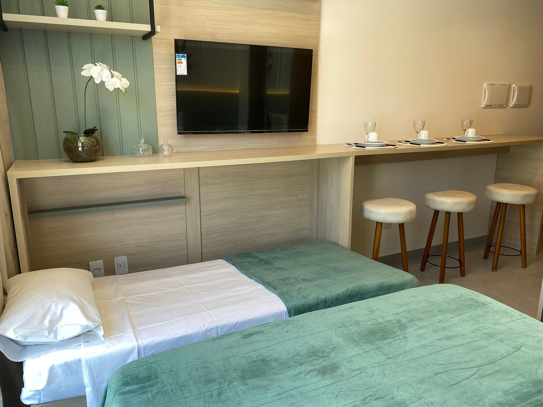 Flat com ar condicionado, Smart TV( possui canais por streaming), wi-fi 300Mega, cama Queen + 01 cama solteiro, guarda roupa com cabides, cozinha totalmente equipada com frigobar, cooktop 02 bocas e microondas, espaço com banquetas para para refeições. Banheiro com chuveiro elétrico, secador de cabelo, armário e espelho.