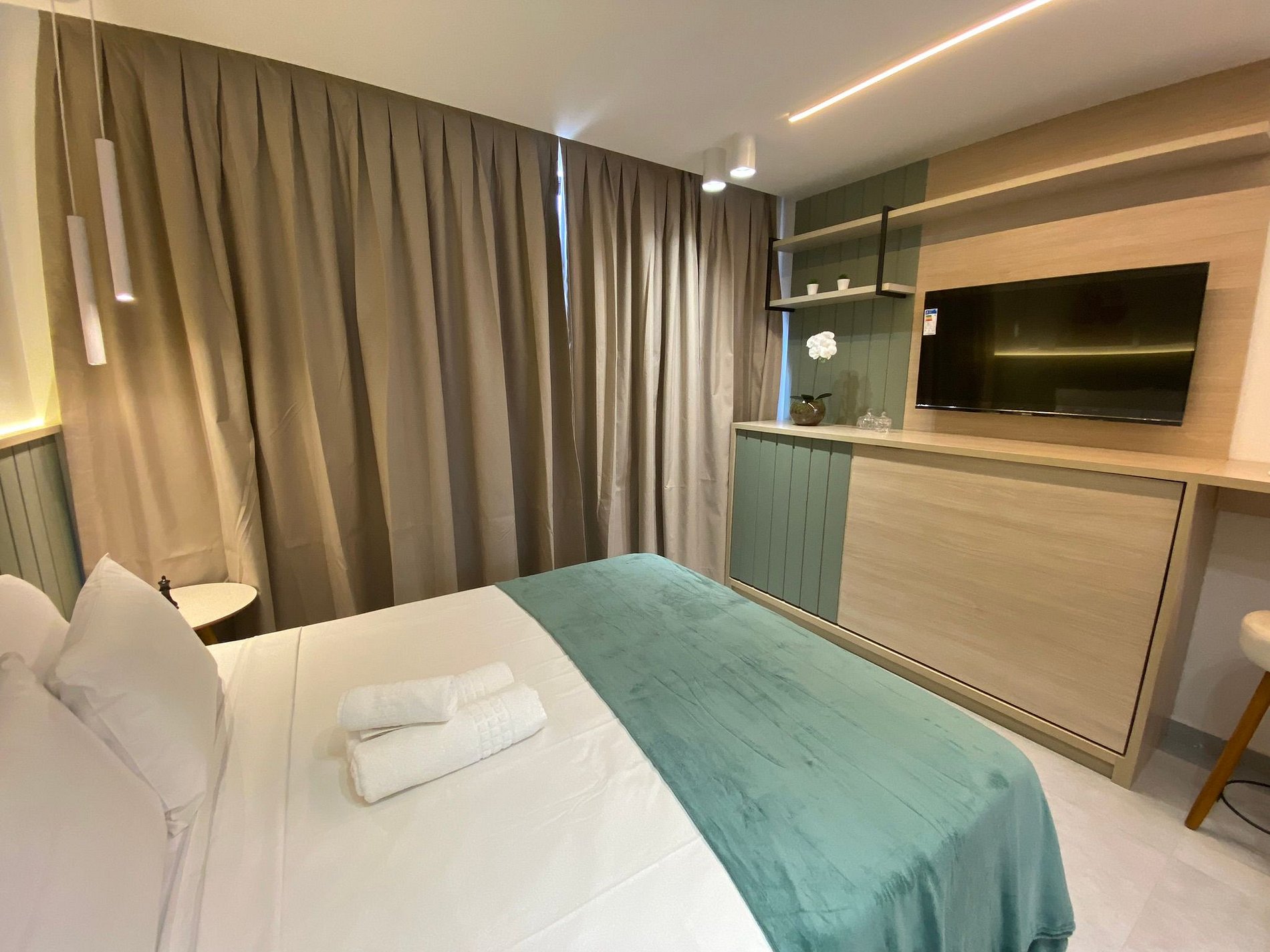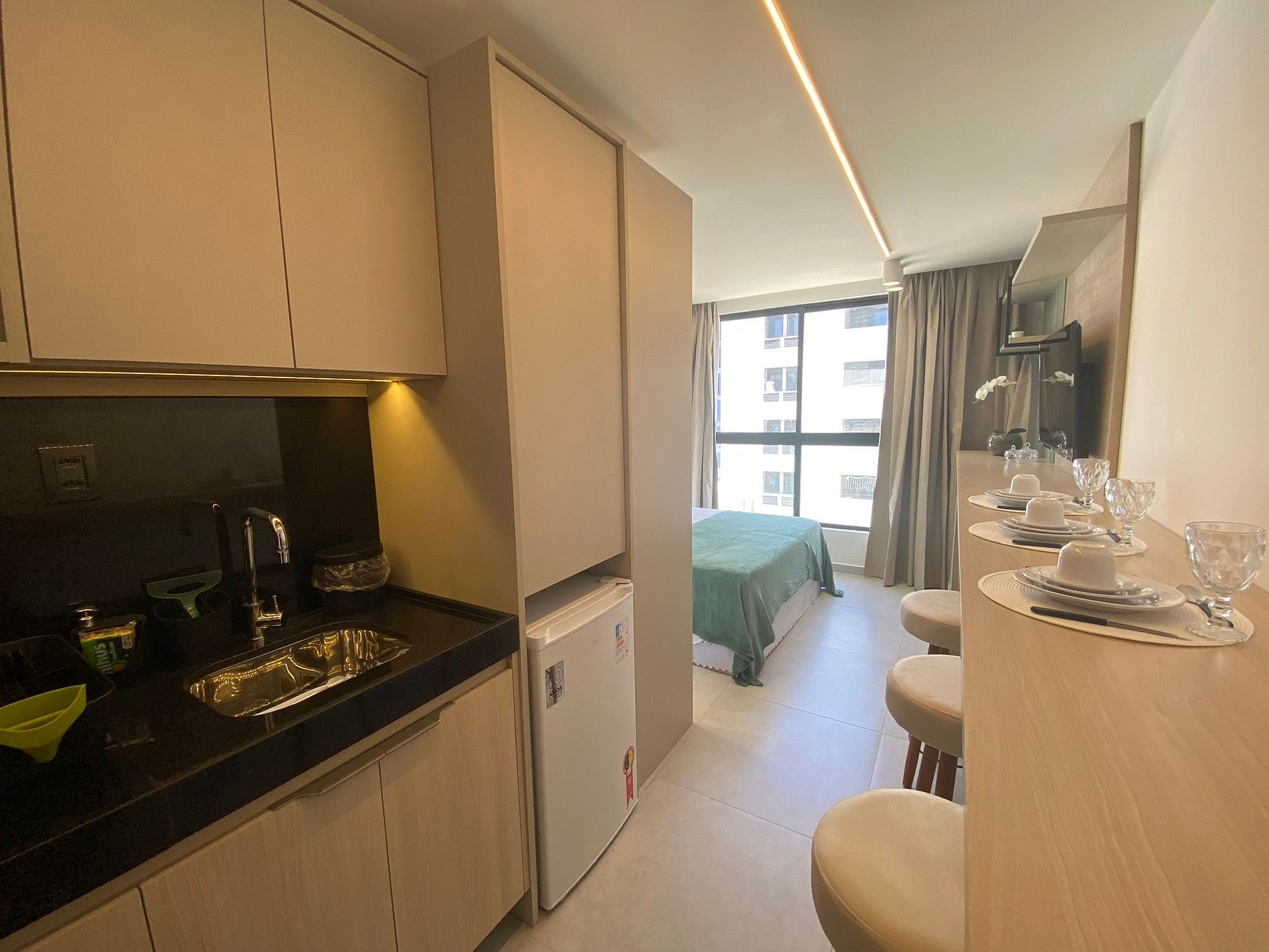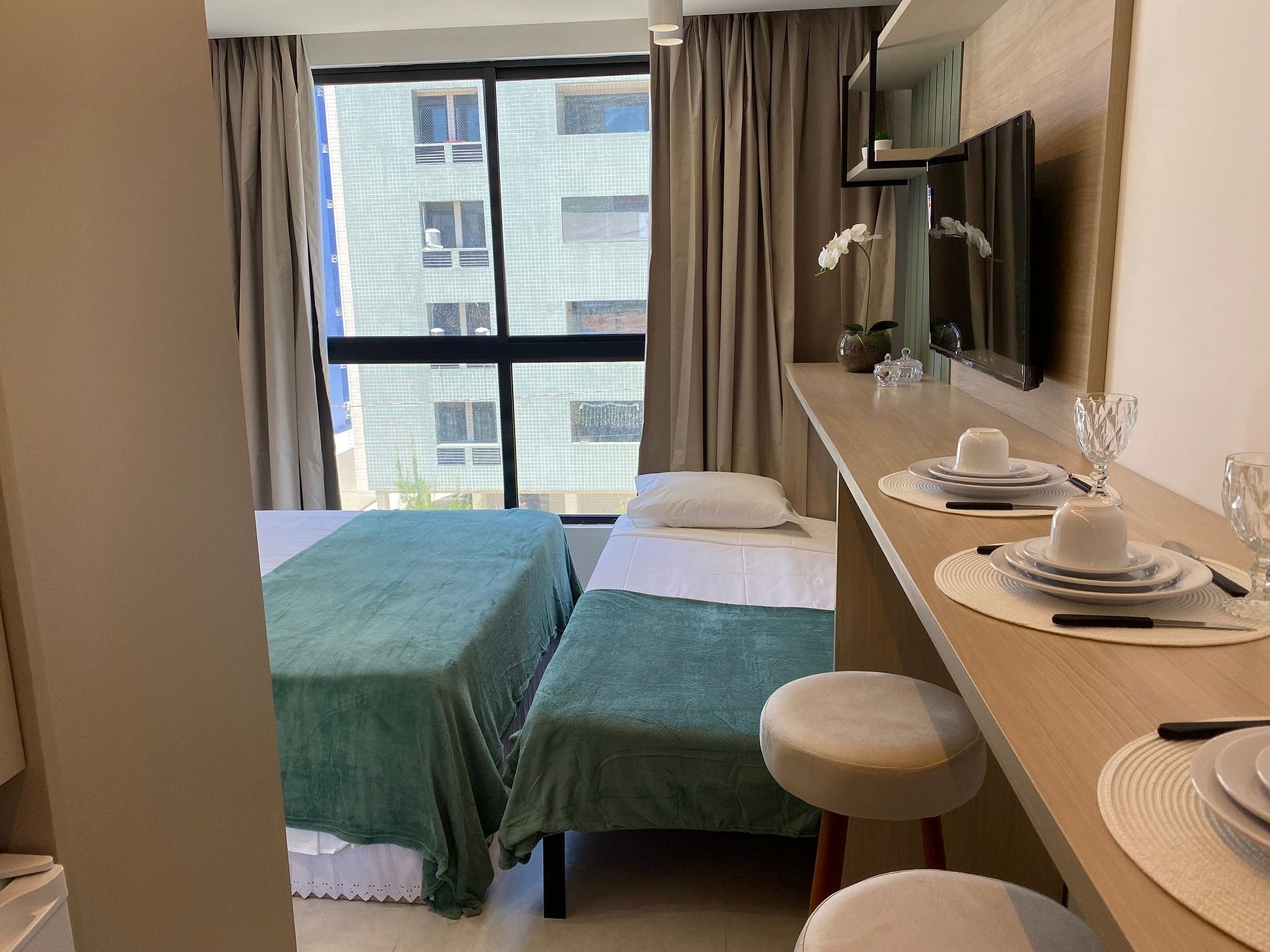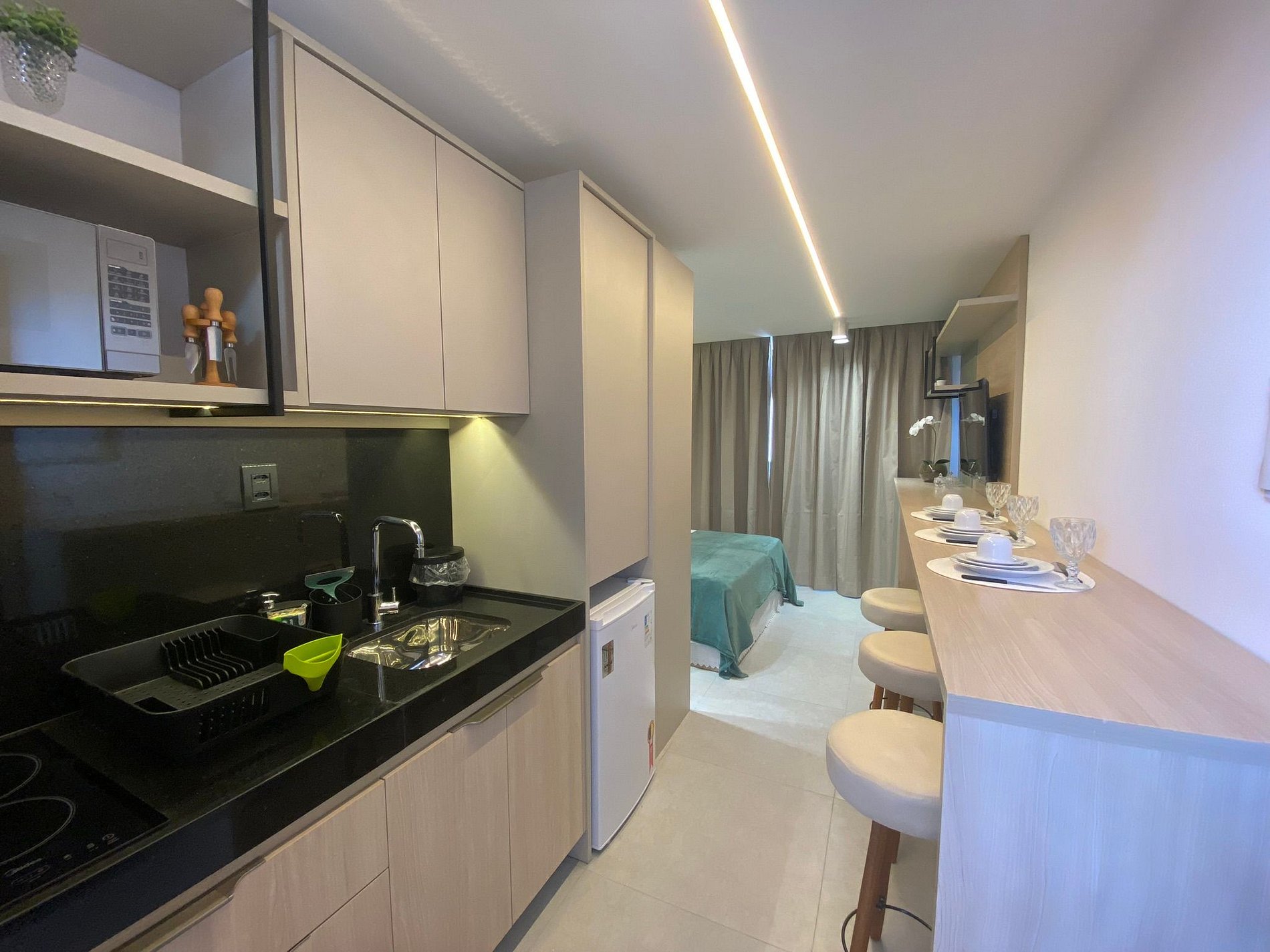 Flat com ar condicionado, Smart TV( possui canais por streaming), wi-fi 300Mega, cama Queen + 01 cama solteiro, guarda roupa com cabides, cozinha totalmente equipada com frigobar, cooktop 02 bocas e microondas, espaço com banquetas para para refeições. Banheiro com chuveiro elétrico, secador de cabelo, armário e espelho.