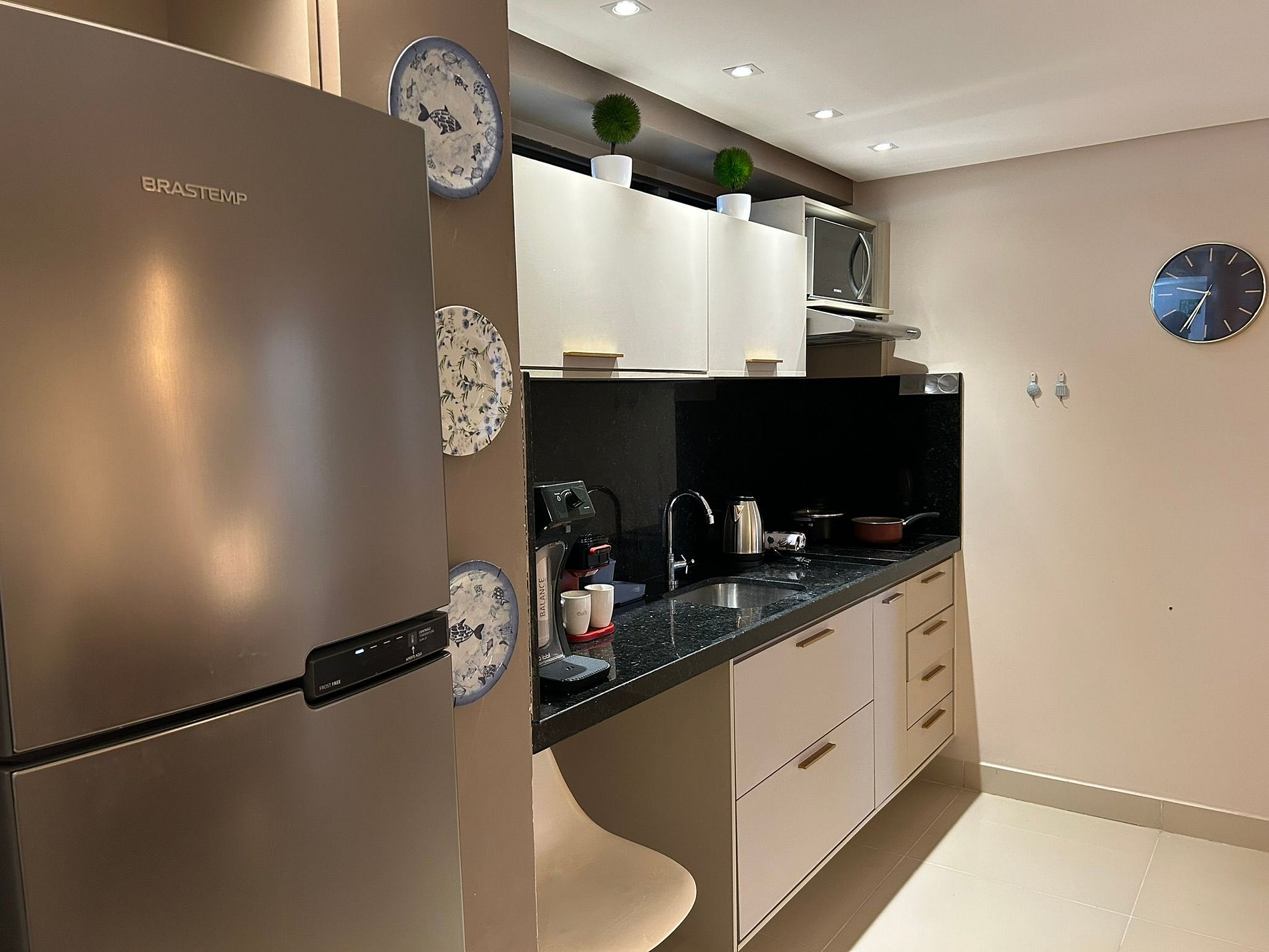 ● Cozinha compacta equipada: cooktop 02 bocas, micro-ondas, geladeira, chaleira elétrica, liquidificador, sanduicheira, cafeteira Cadence, filtro de água, panelas, pratos, talheres e copos.