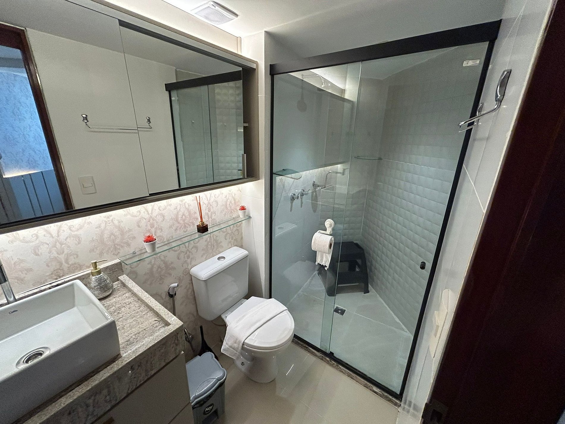 ● Banheiro com chuveiro elétrico, ducha higiênica, escova secadora de cabelo e espelho
