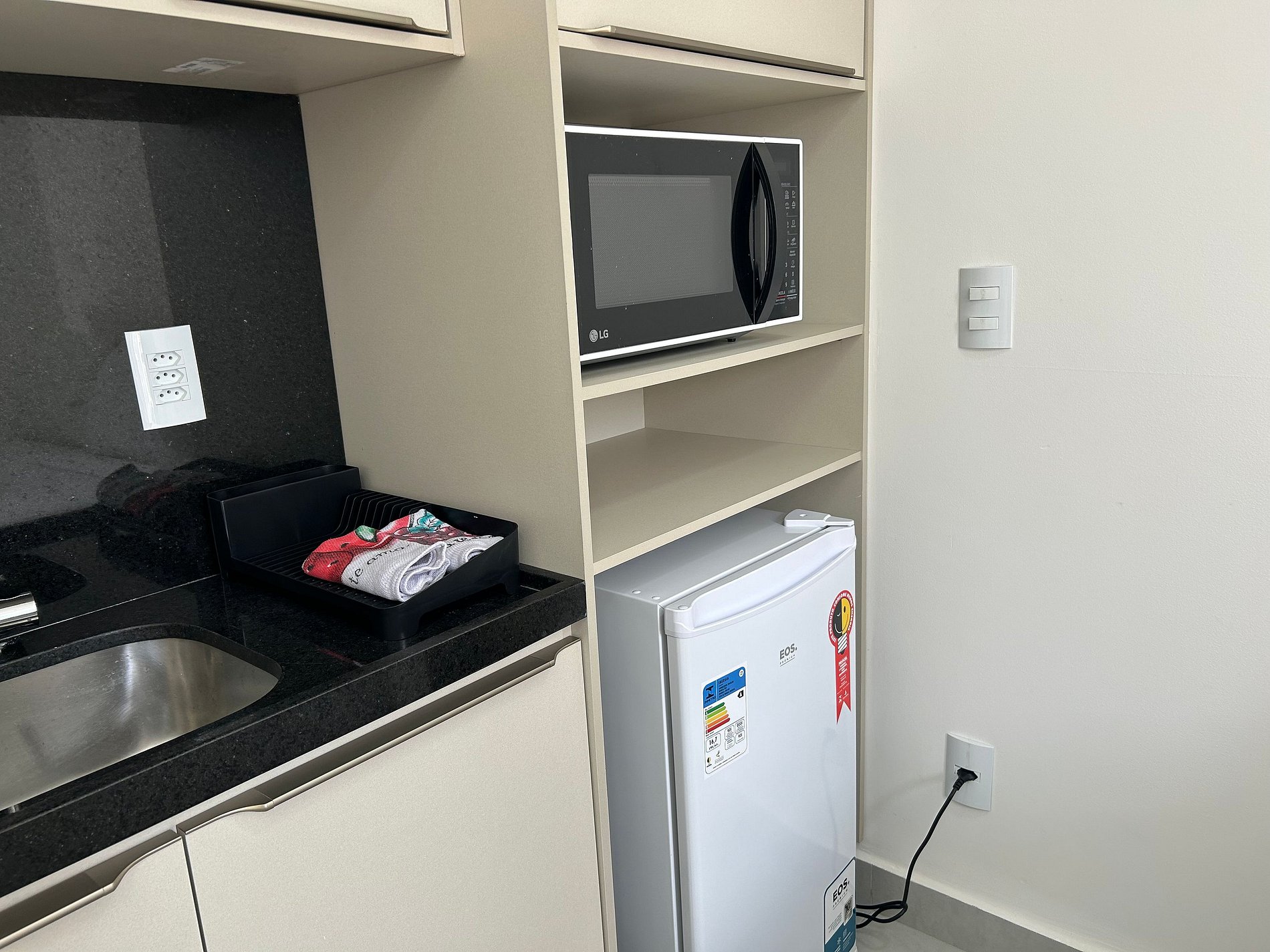 ● Cozinha compacta equipada com micro-ondas, frigobar, cafeteira, liquidificador, sanduicheira, pratos, talheres e copos.