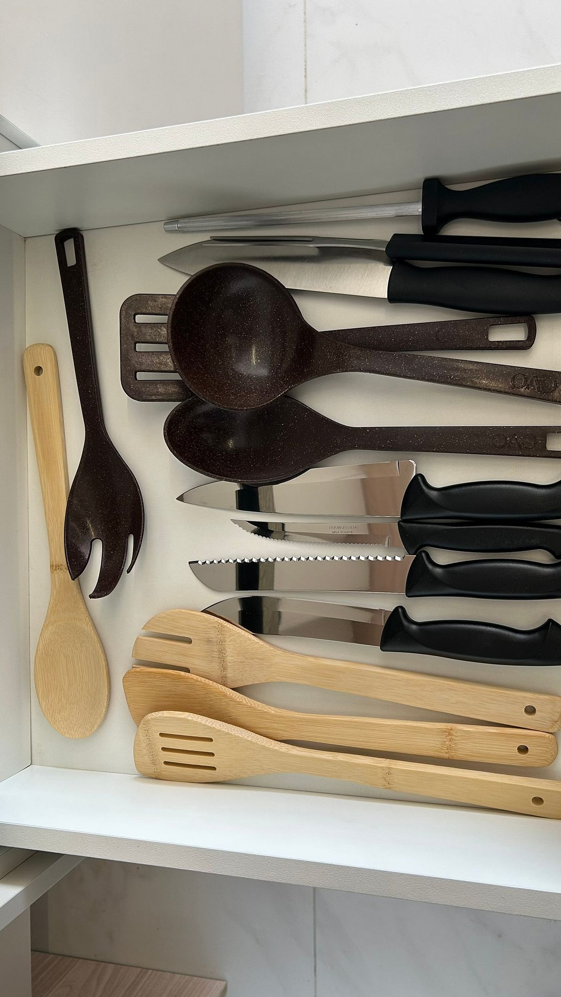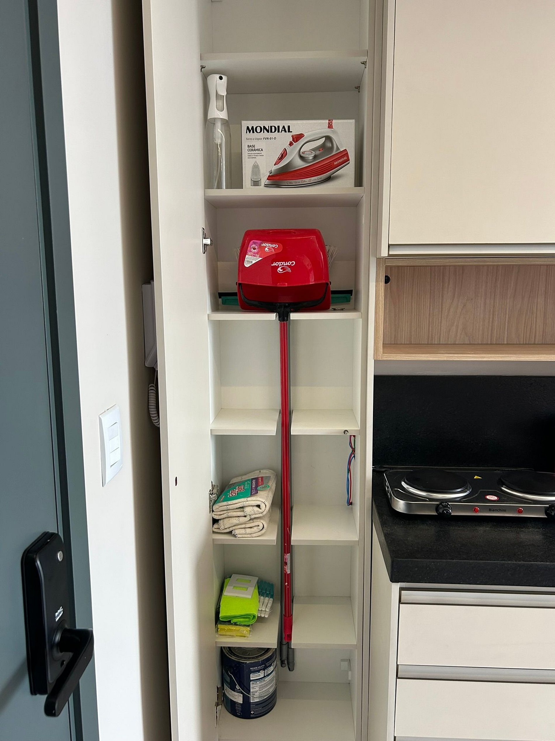 ● Vassoura, pá, rodo e balde - ficam no móvel vertical perto da porta de entrada