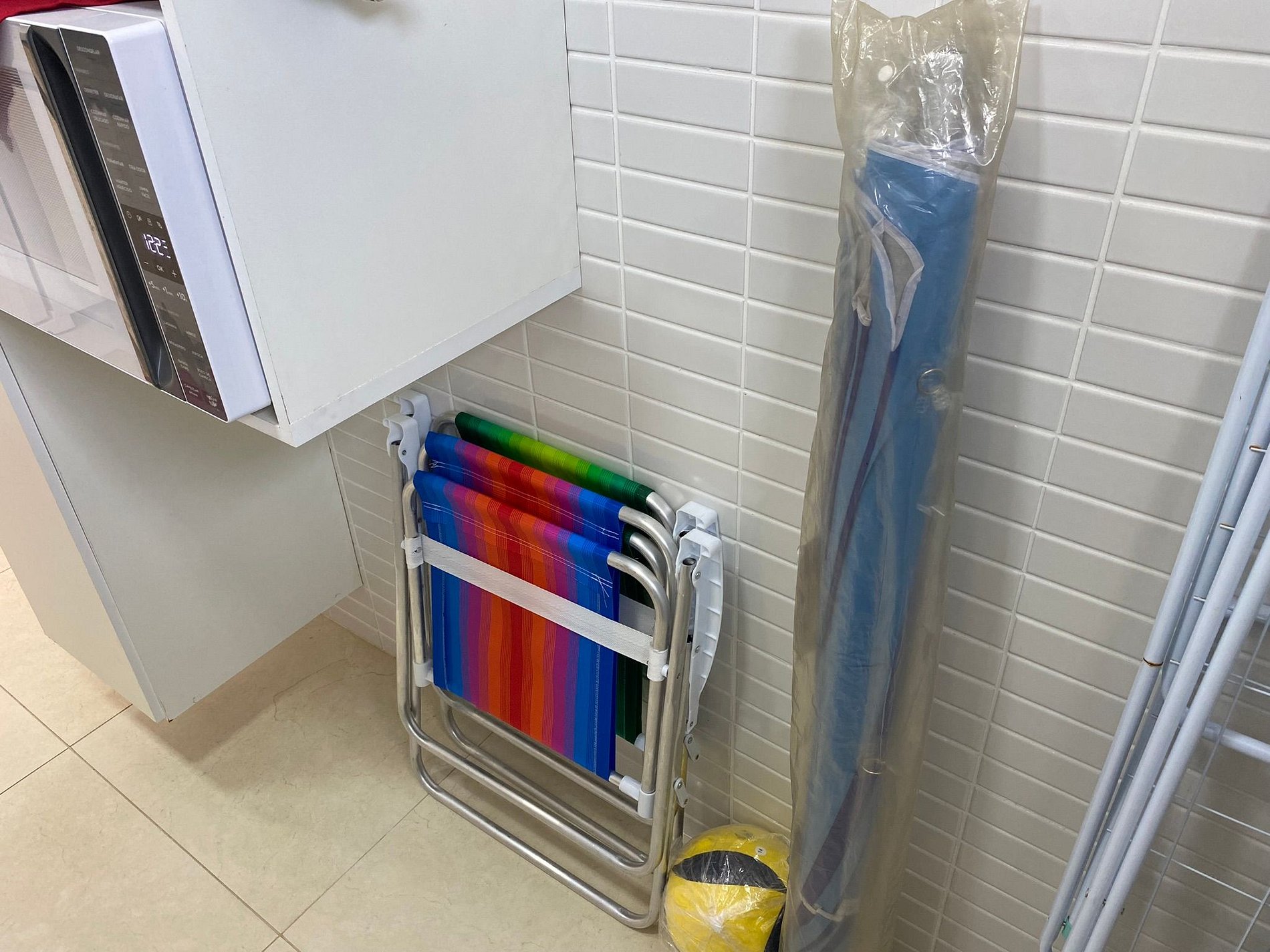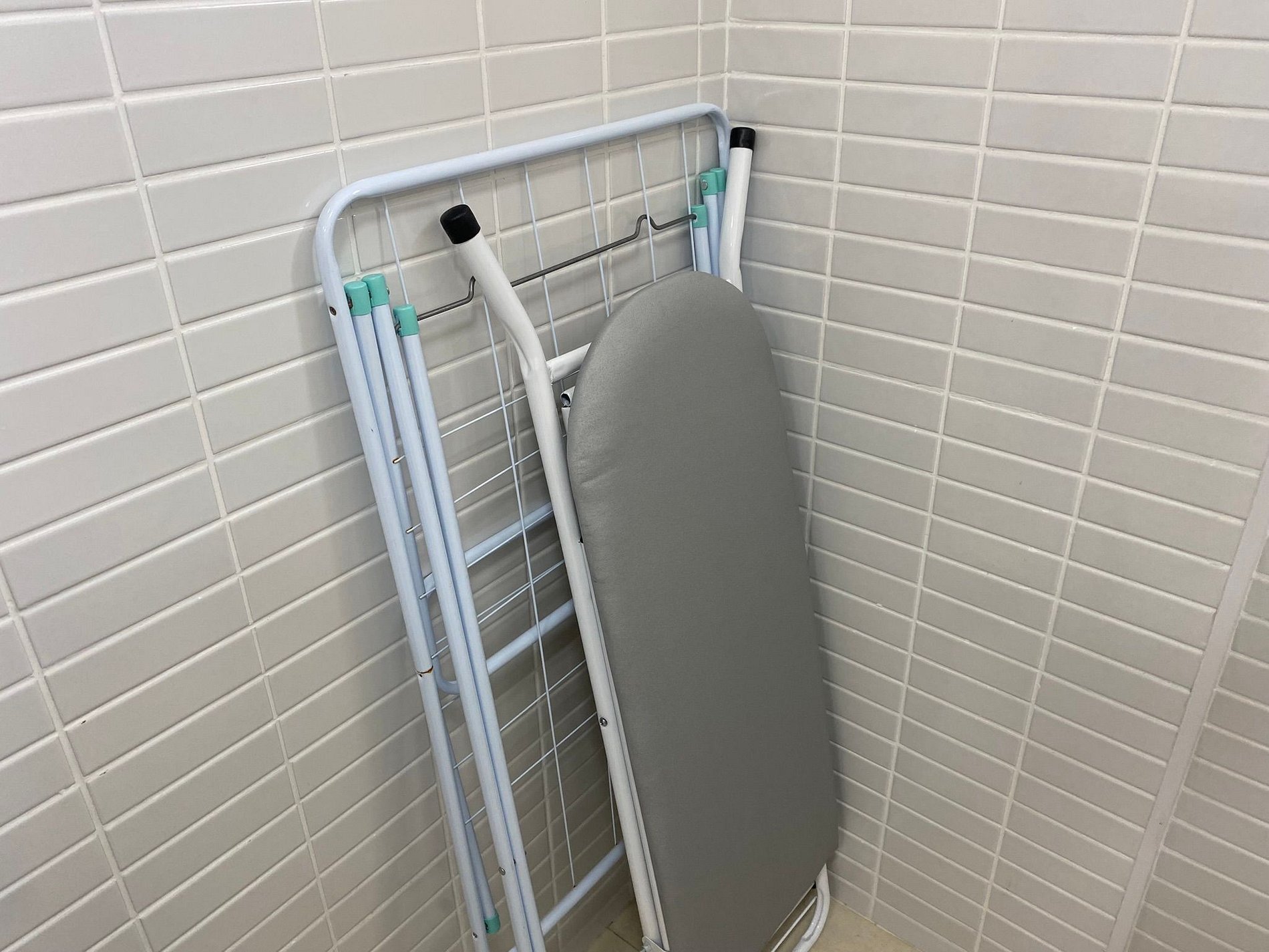 Área de serviço com máquina de lavar roupas, varal, ferro e tábua de passar.