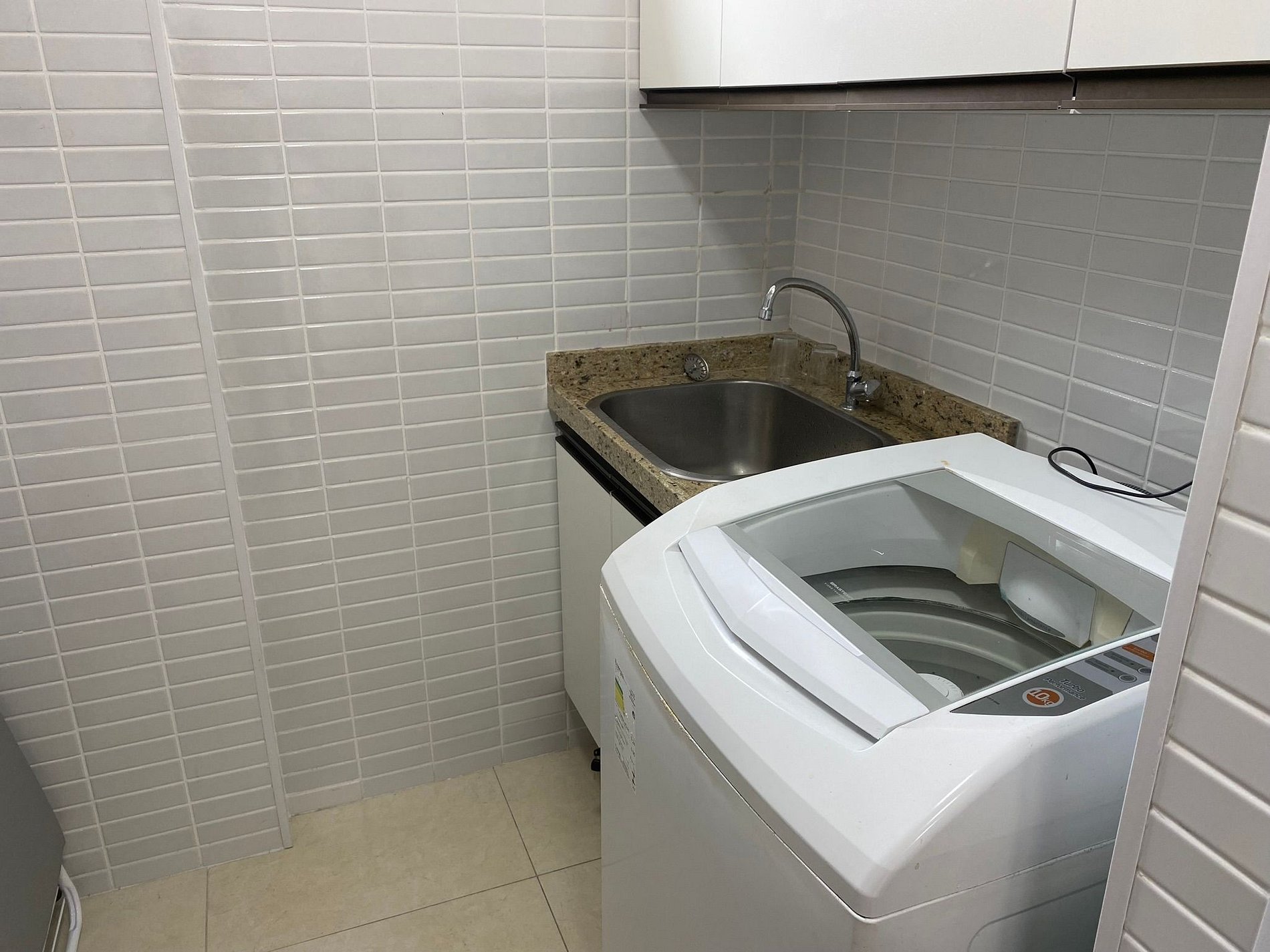 Área de serviço com máquina de lavar roupas, varal, ferro e tábua de passar.