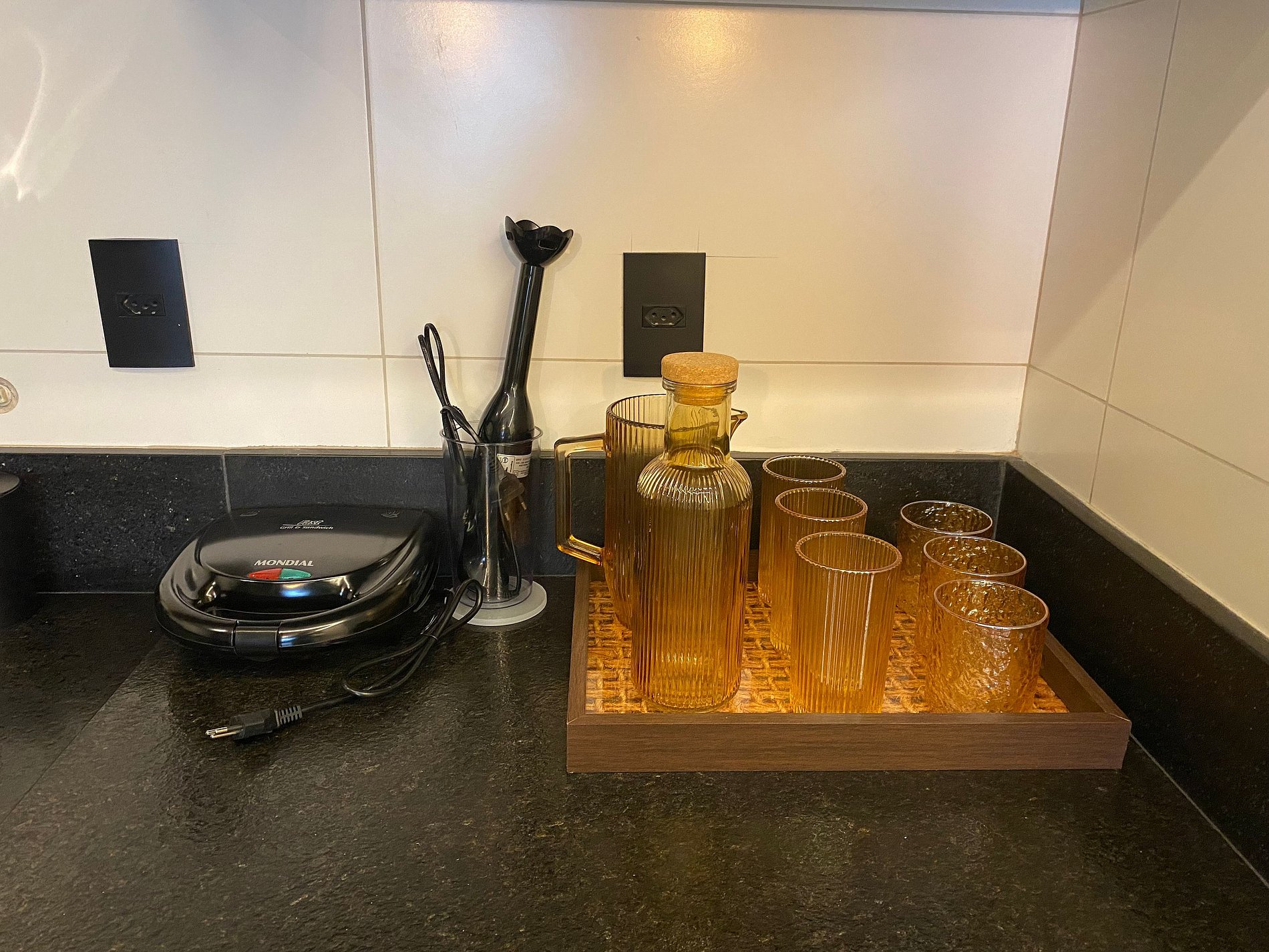 Cozinha equipada com geladeira, cooktop , microondas, cafeteira e sanduicheira.