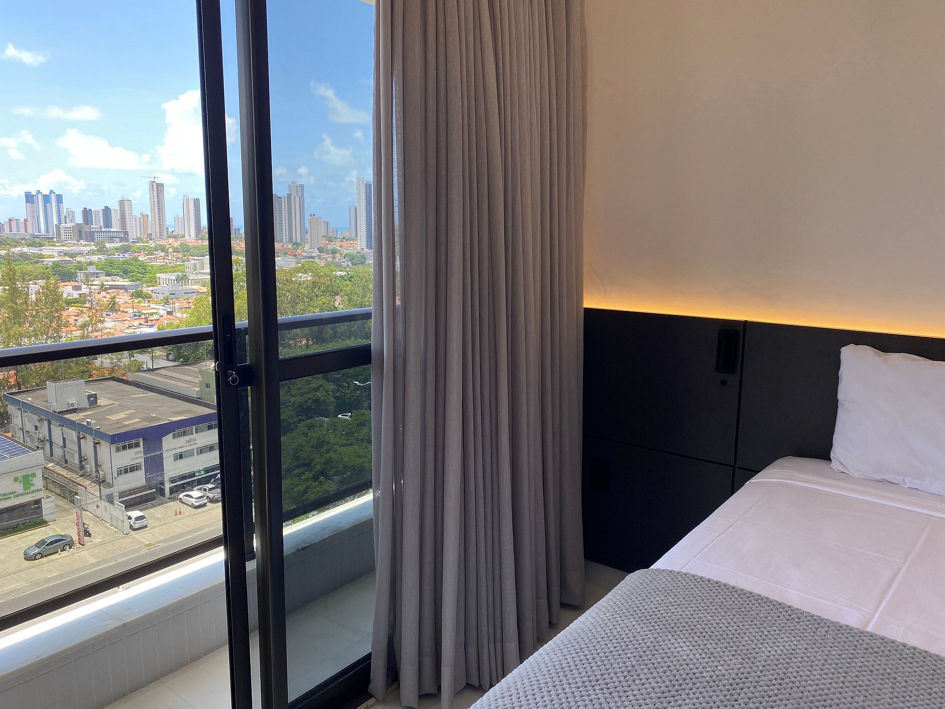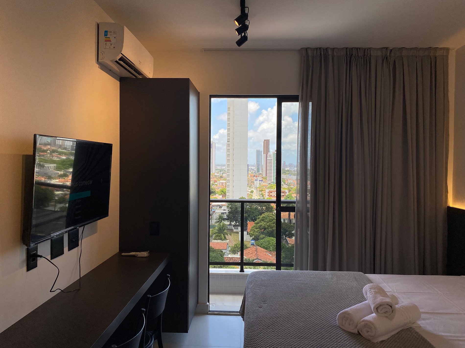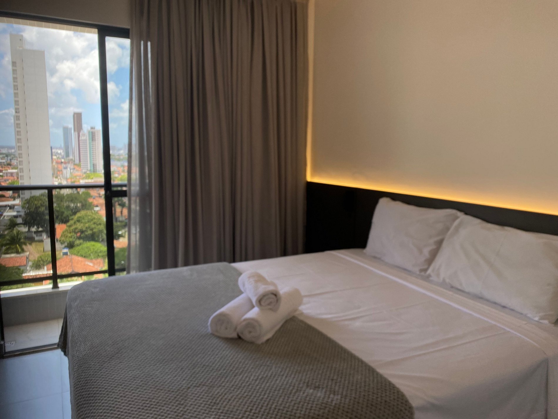O flat é mobiliado e equipado com utensílios para preparo de refeições como lanches e bebidas, além de dispor de enxoval como lençóis, toalhas e travesseiros para a sua entrada. Da varanda é possível apreciar a cidade, um pouco do mar e também o belíssimo por do sol.