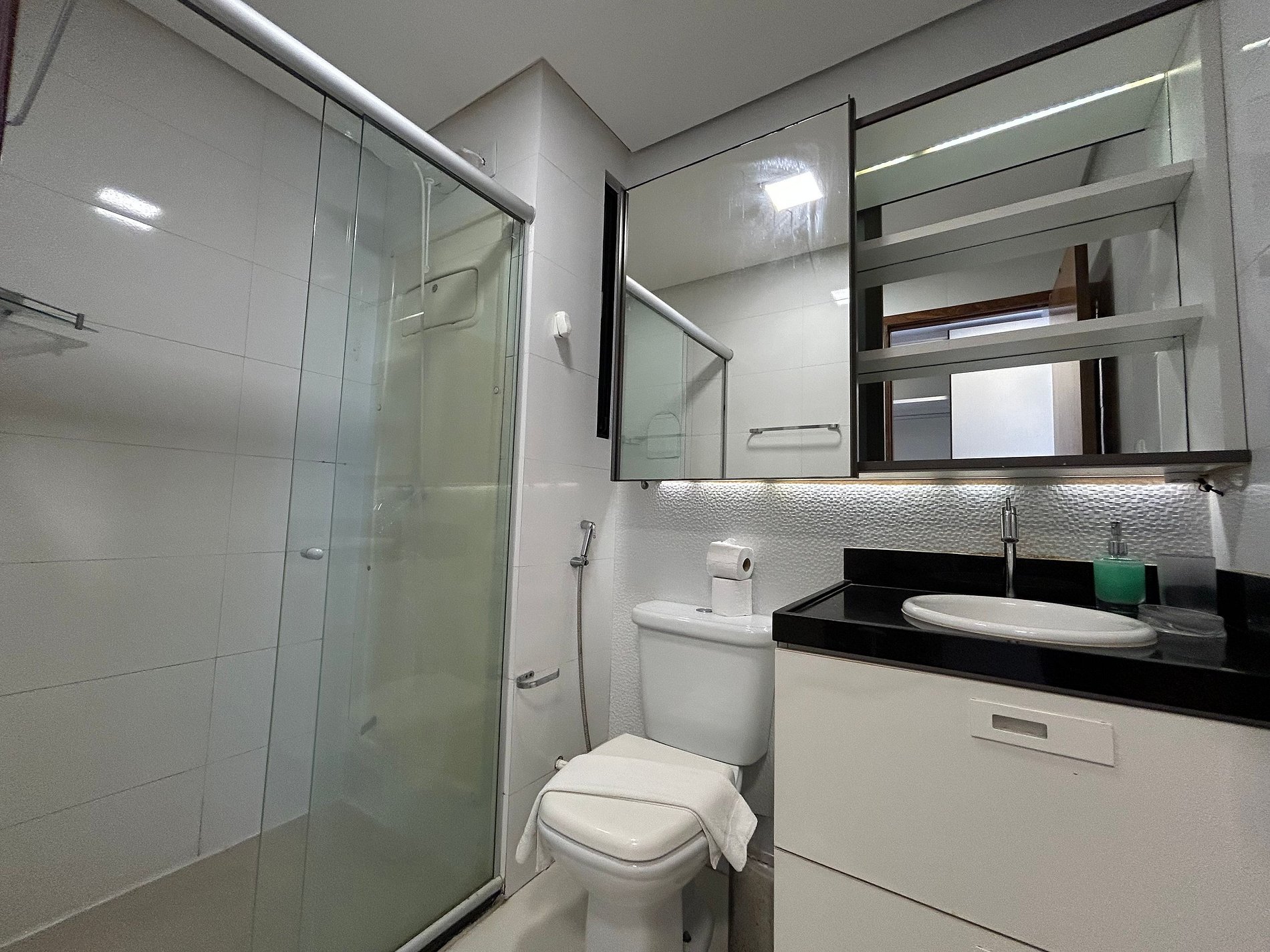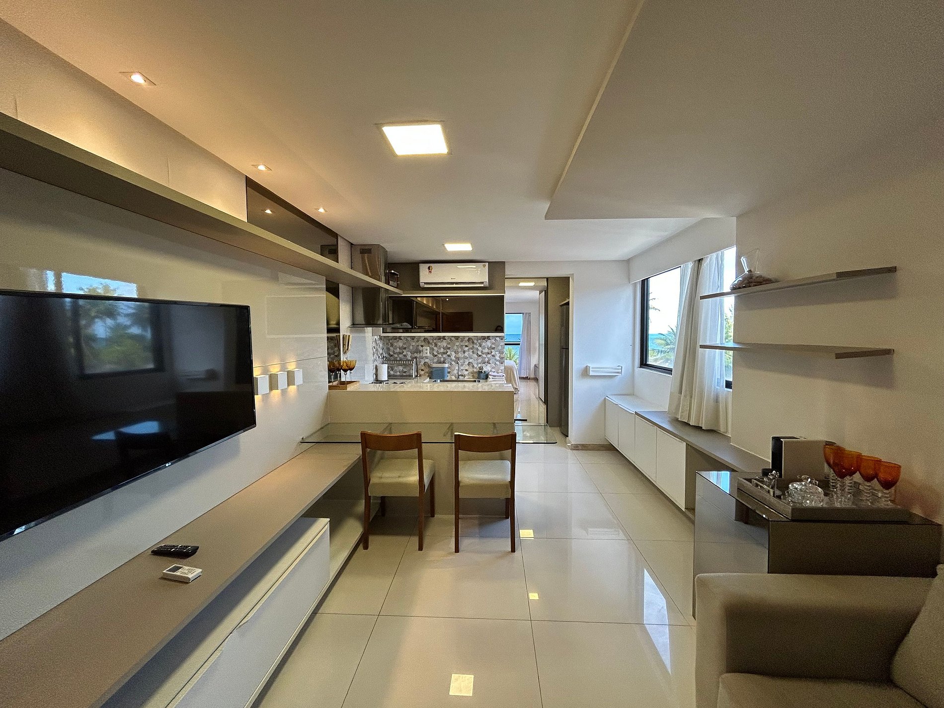 O flat é mobiliado, decorado e equipado com eletrodomésticos e utensílios para preparo de refeições, além de dispor de enxoval completo de lençóis, toalhas e travesseiros para a sua entrada.
