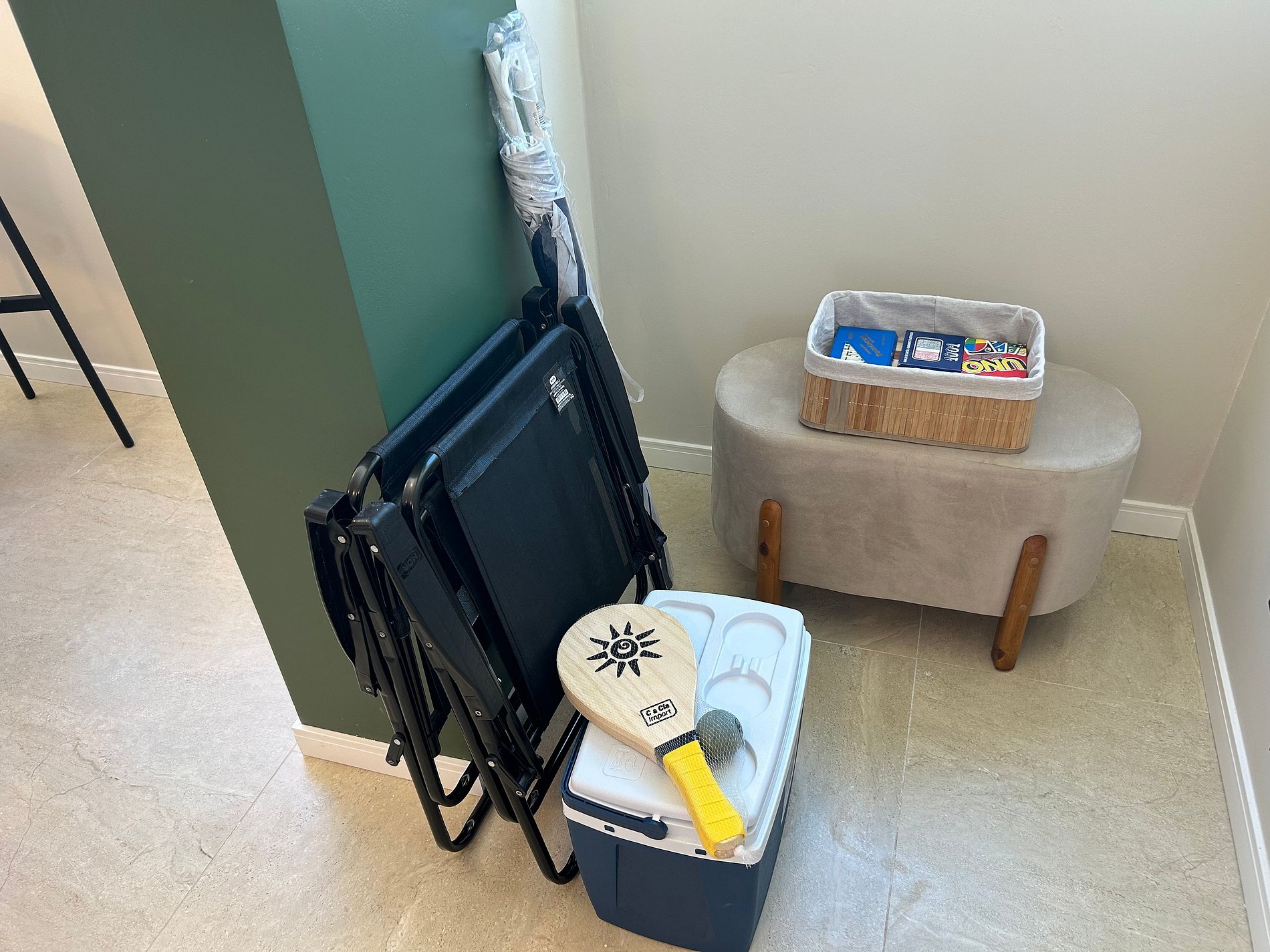 ● Ferro, tábua de passar, cadeiras de praia, guarda-sol e cooler