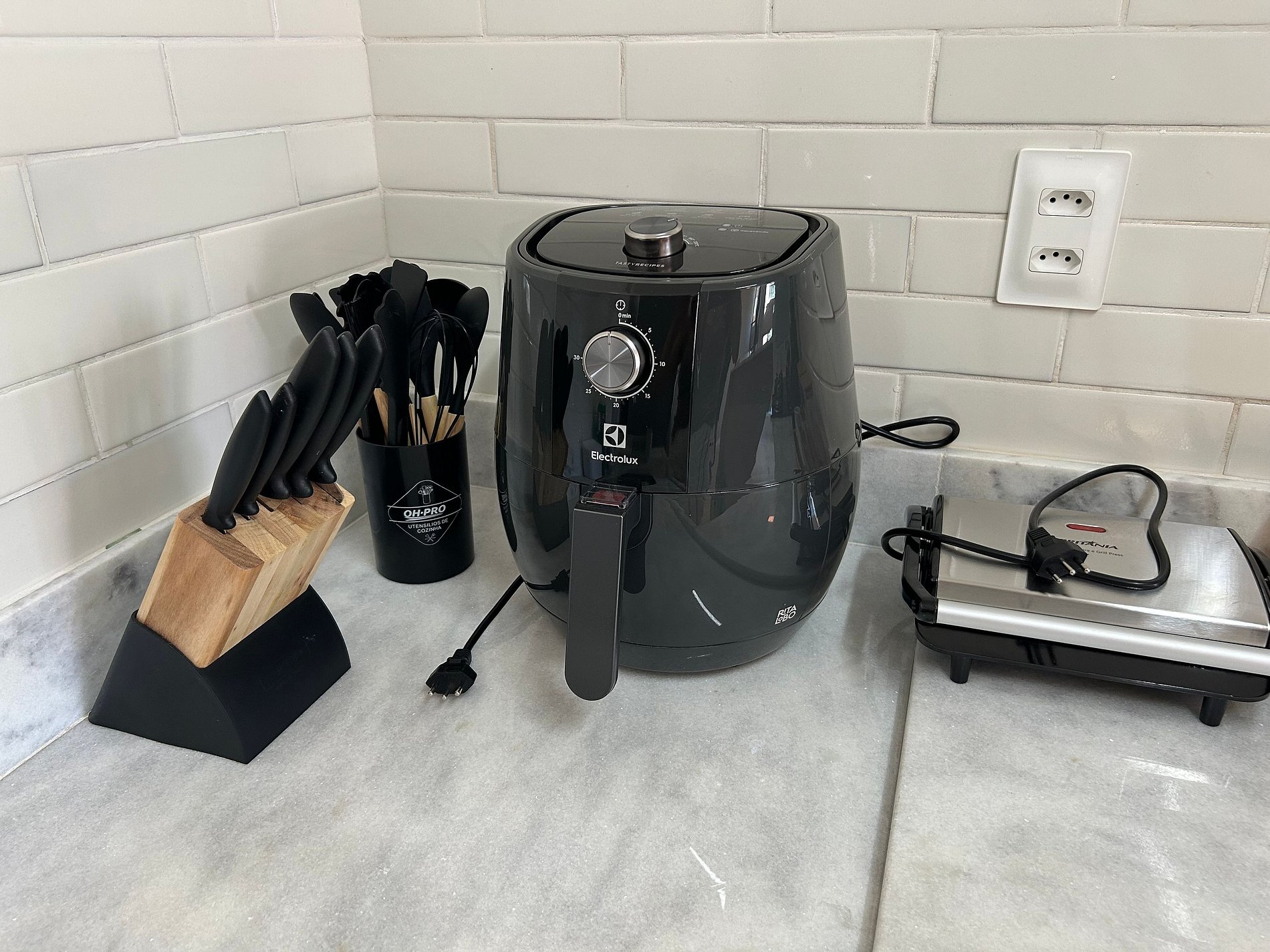 ● Cozinha americana equipada: cooktop, micro-ondas, airfryer, geladeira, cafeteira italiana, cafeteira elétrica, filtro de água, liquidificador, sanduicheira, panelas e utensílios