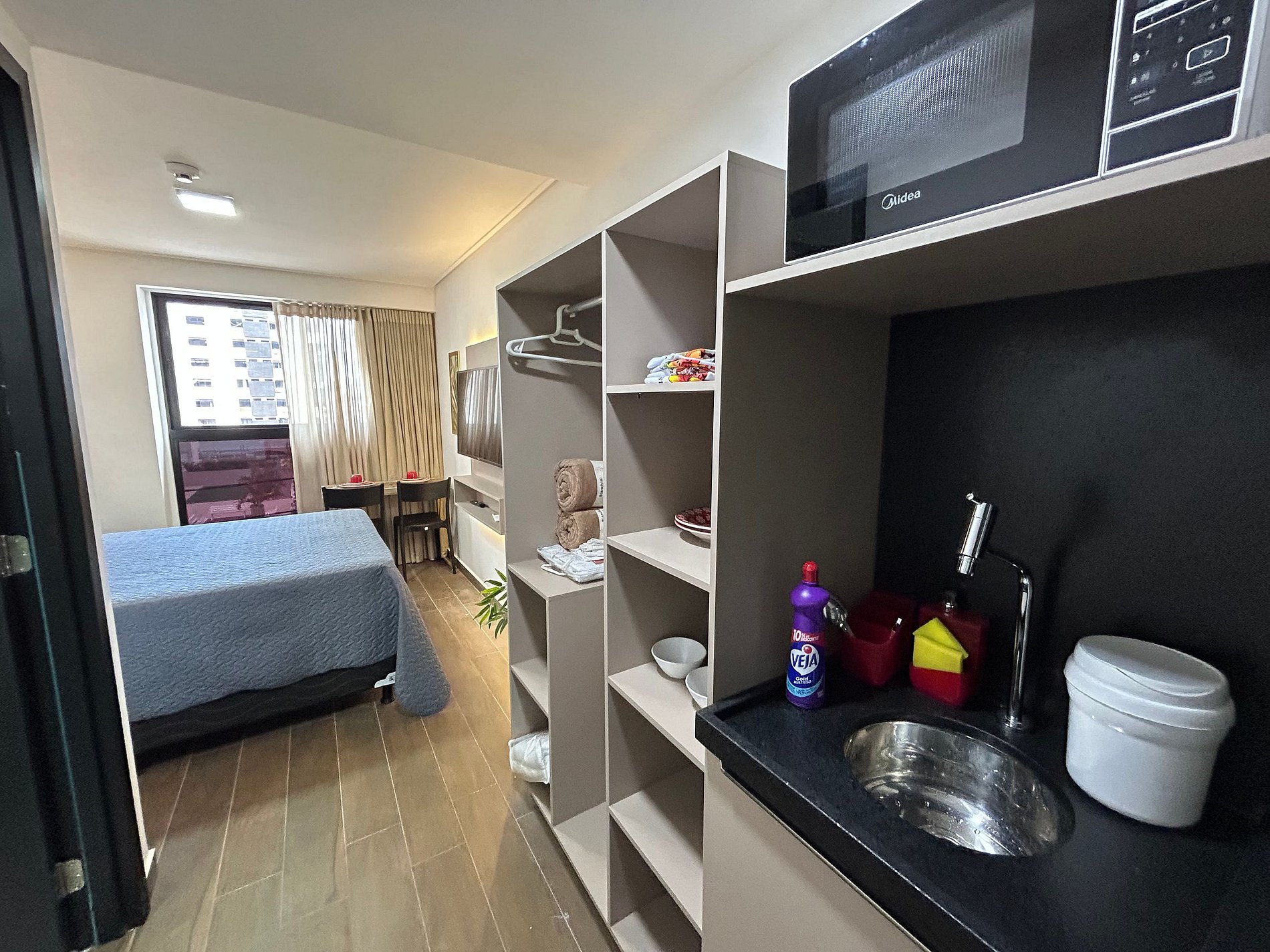 A cozinha compacta está equipada com frigobar, microondas, liquidificador, sanduicheira e cafeteira.