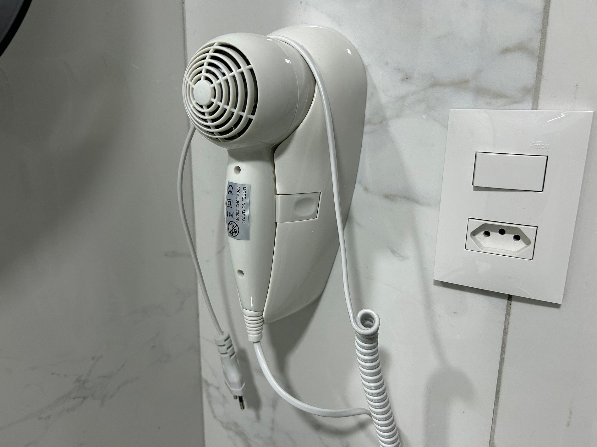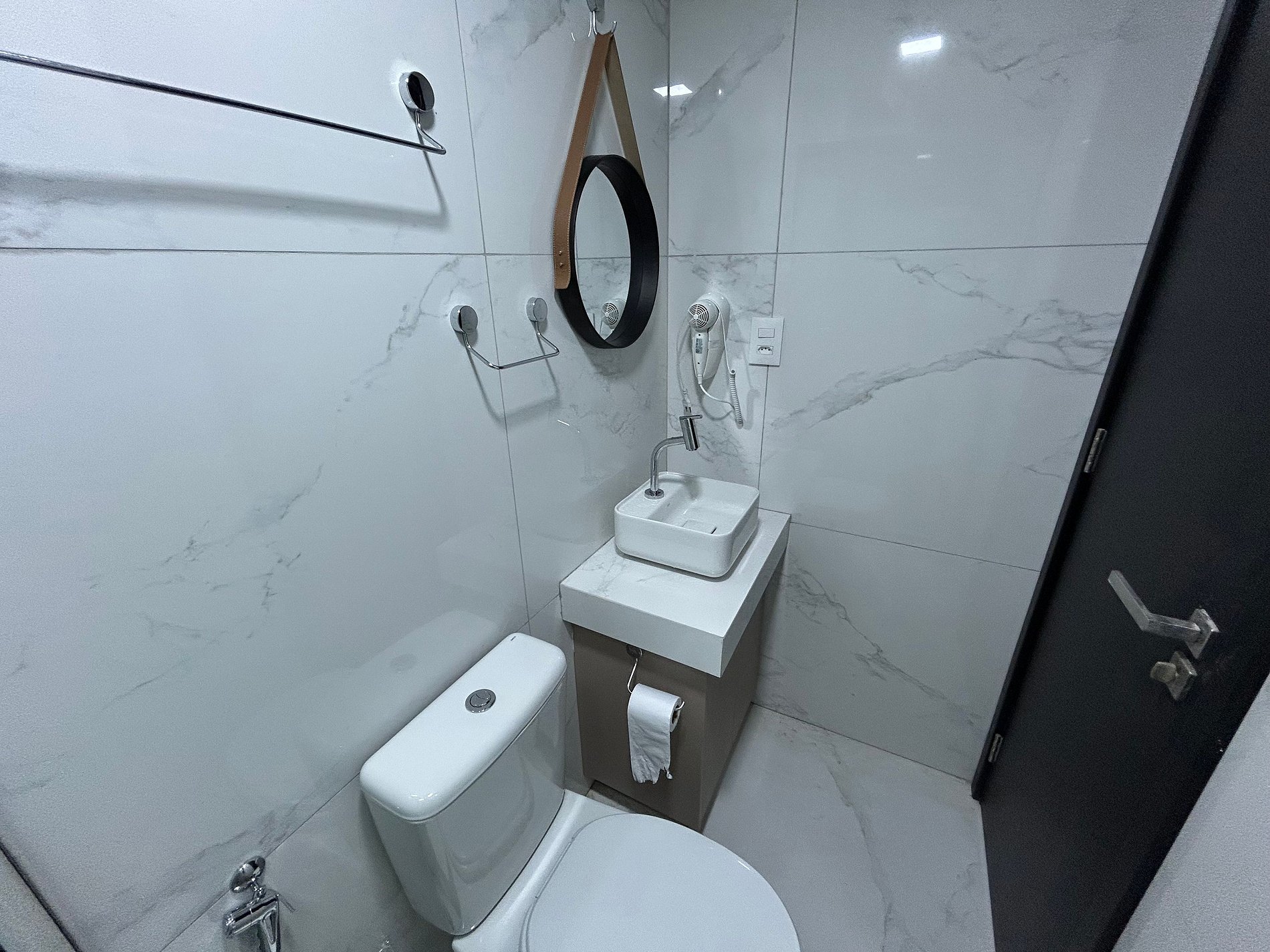 Banheiro com chuveiro elétrico, secador de cabelo, ducha higiênica, armário e espelho.