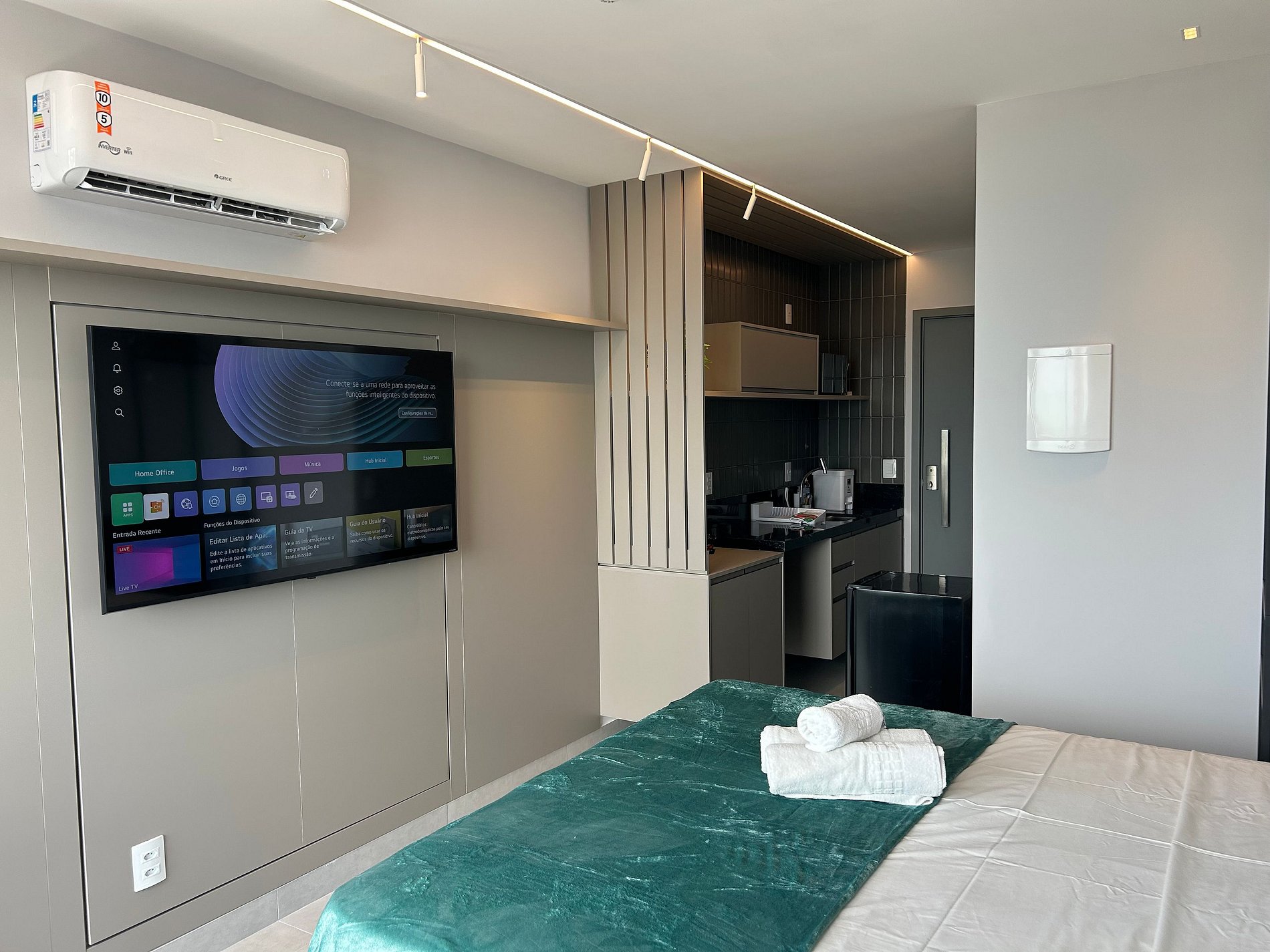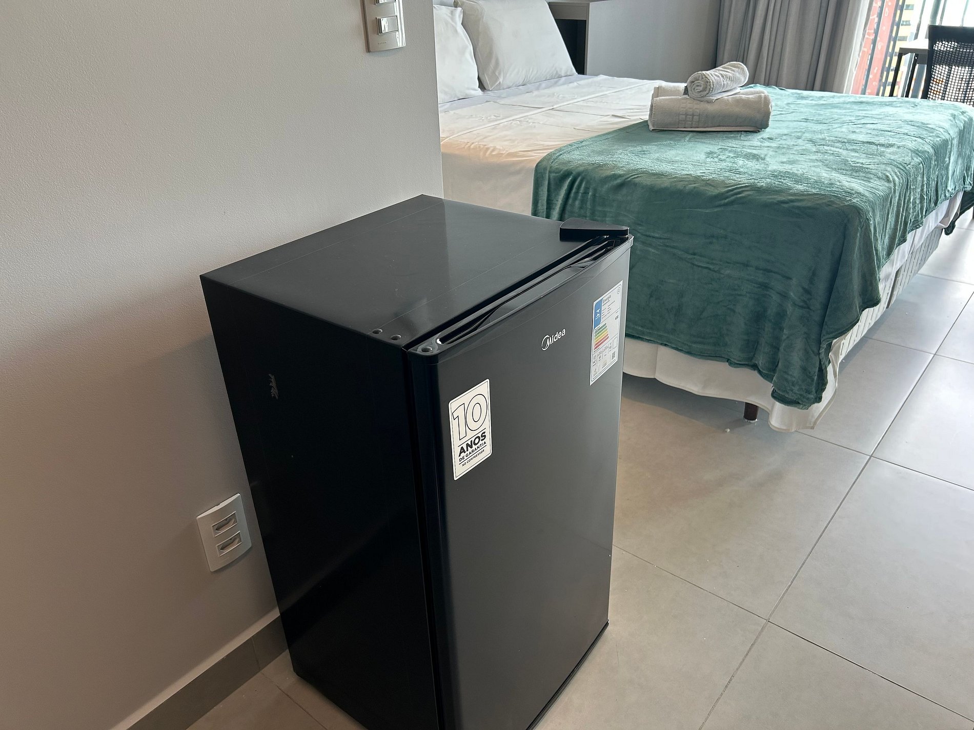 Cama casal, Ar-condicionado, Smart tv, microondas, sanduicheira, frigobar, copos, pratos e talheres são fornecidos.