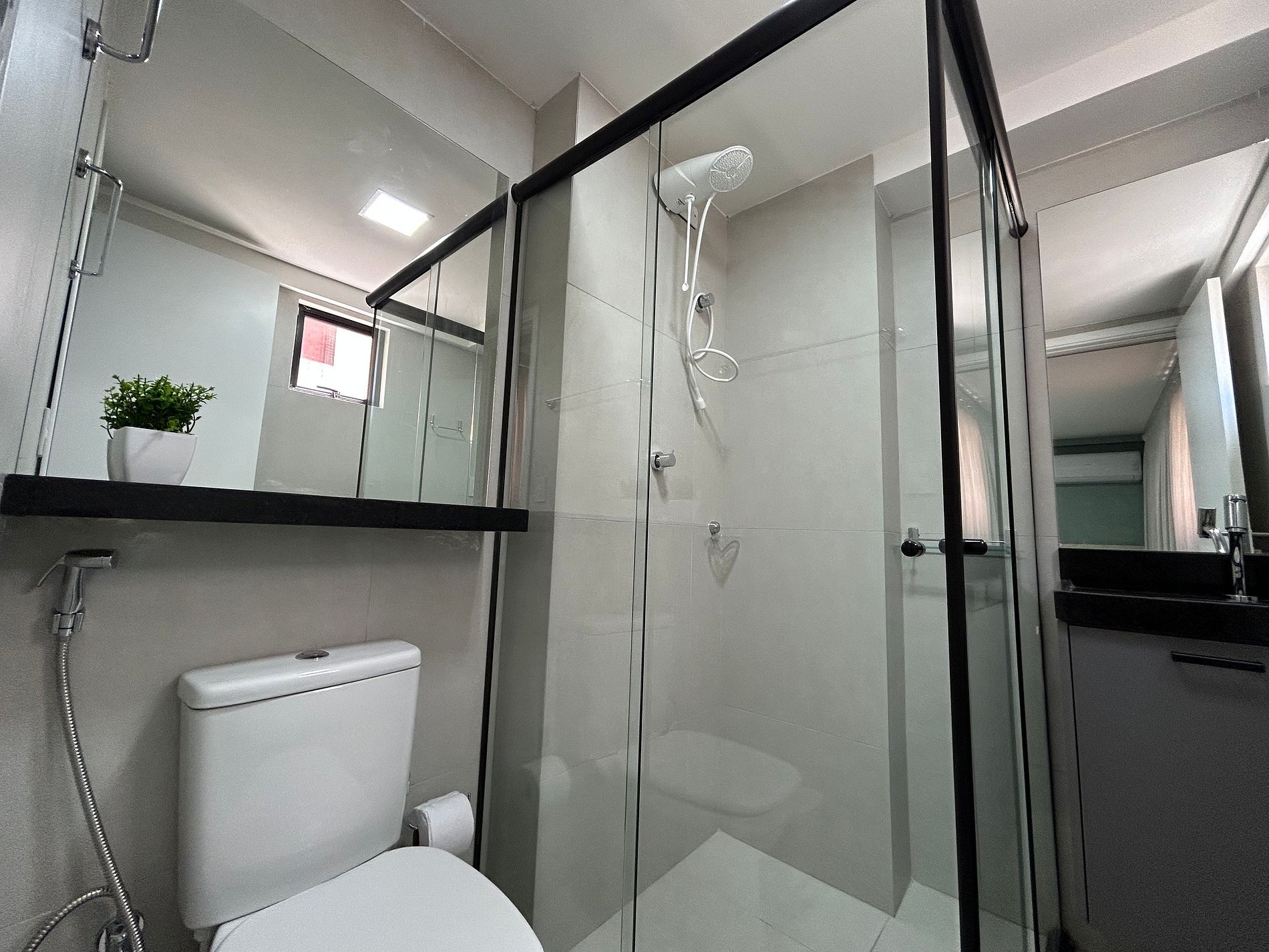 Banheiro com duchinha higiênica, secador de cabelo e chuveiro elétrico.