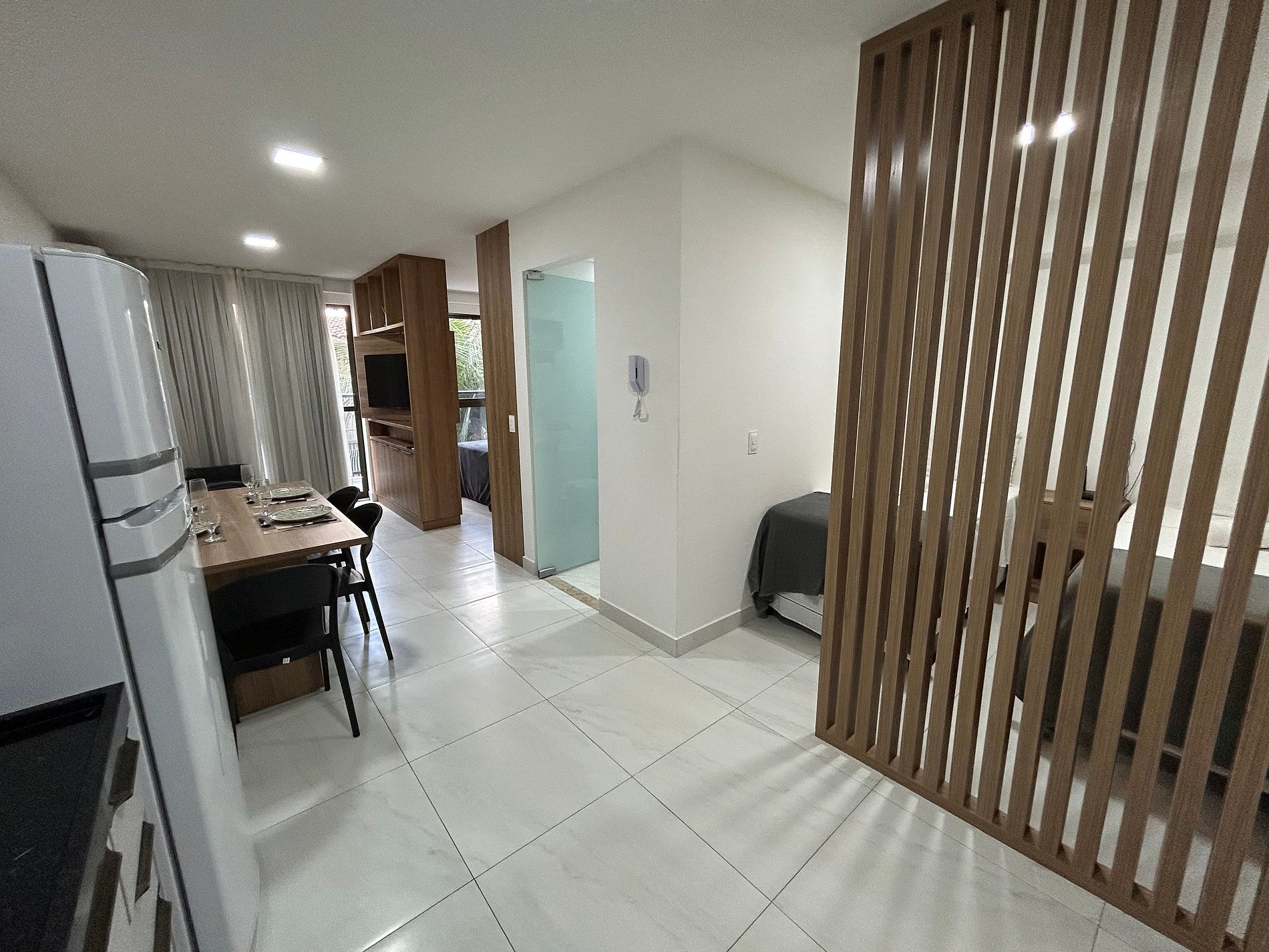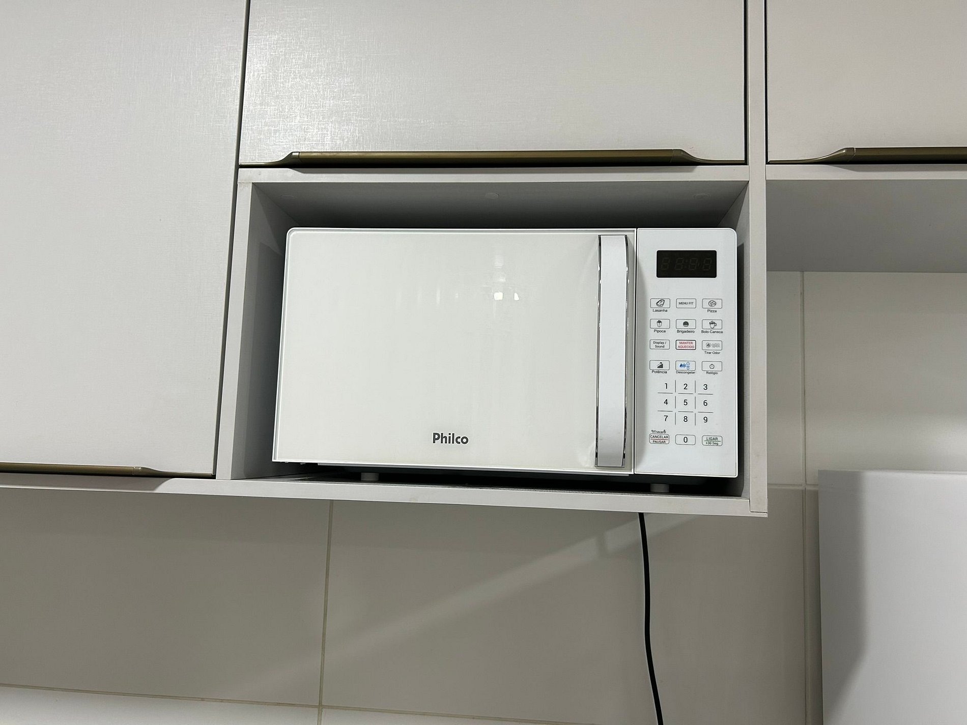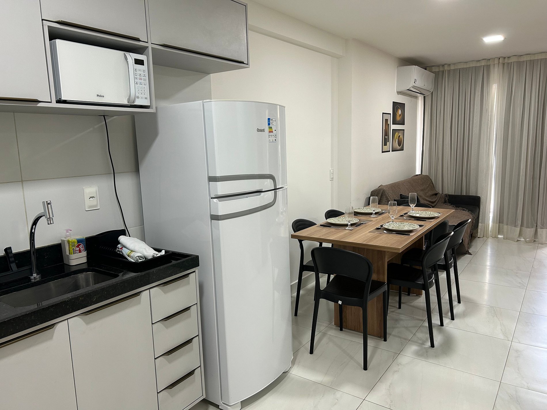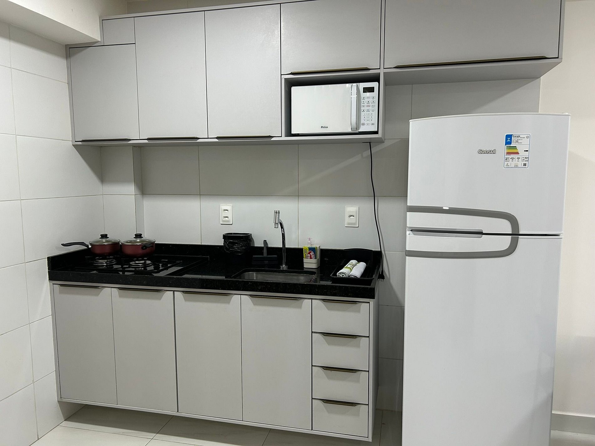 Em localização privilegiada a poucos passos da praia de Tambaú, o lindo flat tem cozinha compacta equipada com geladeira, microondas, sanduicheira, liquidificador, cooktop duas bocas, panelas , louças e talheres.