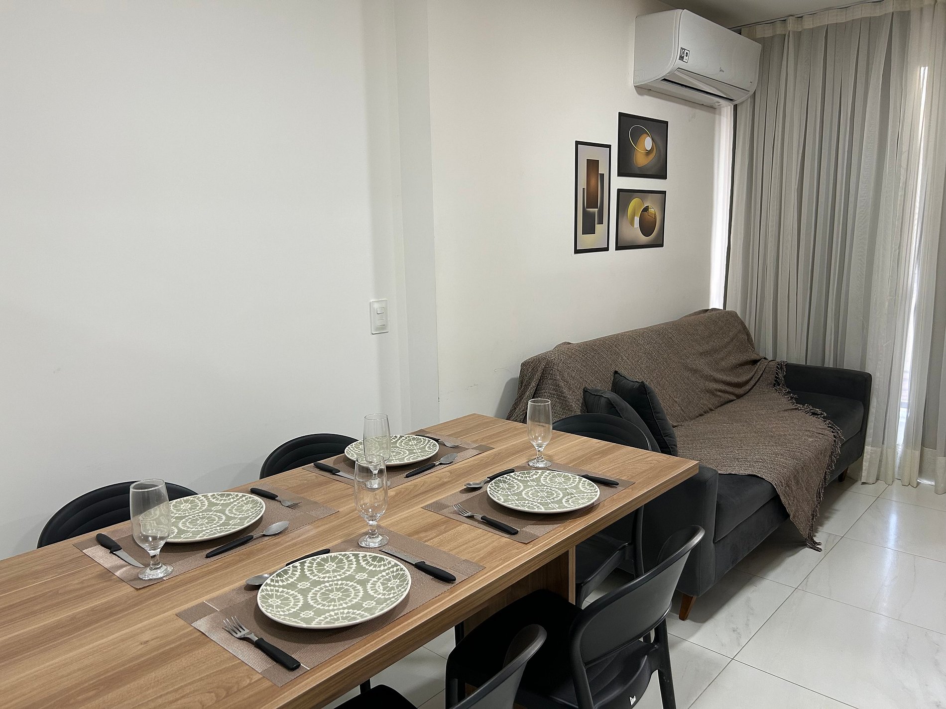 Sala com ar-condicionado que atende a todos os cômodos , mesa e cadeiras para refeições e Smart Tv