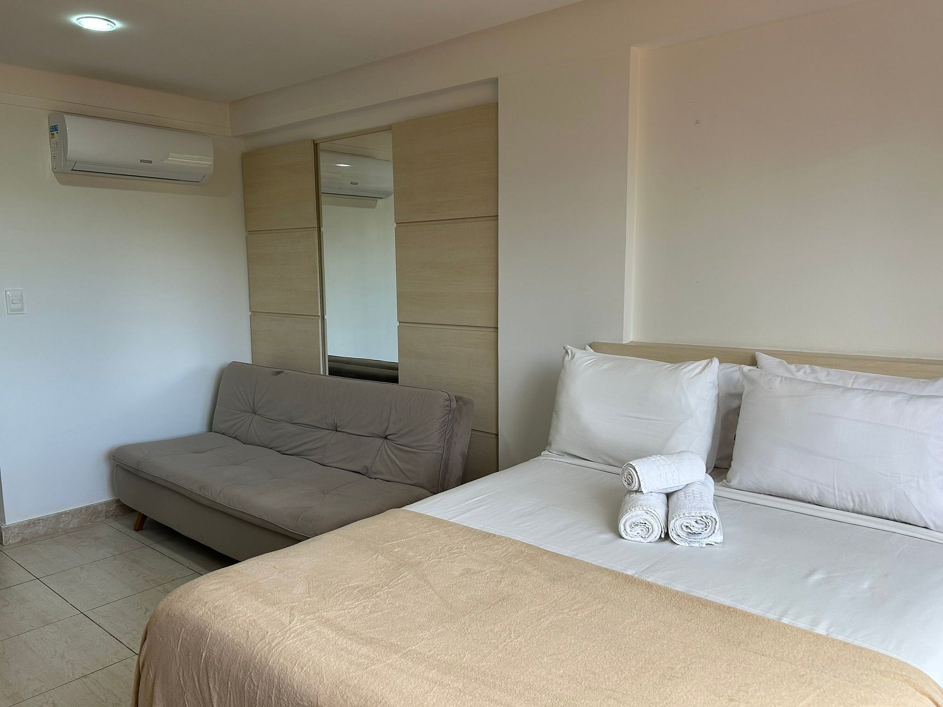 Apartamento decorado, equipado com cama casal e sofá cama , acomoda até 03 pessoas.