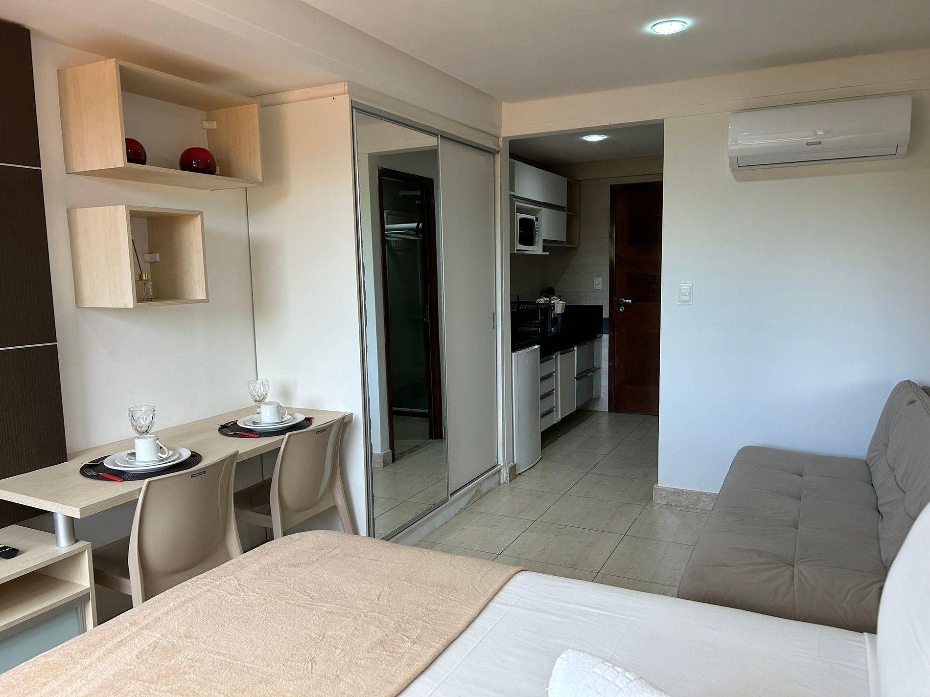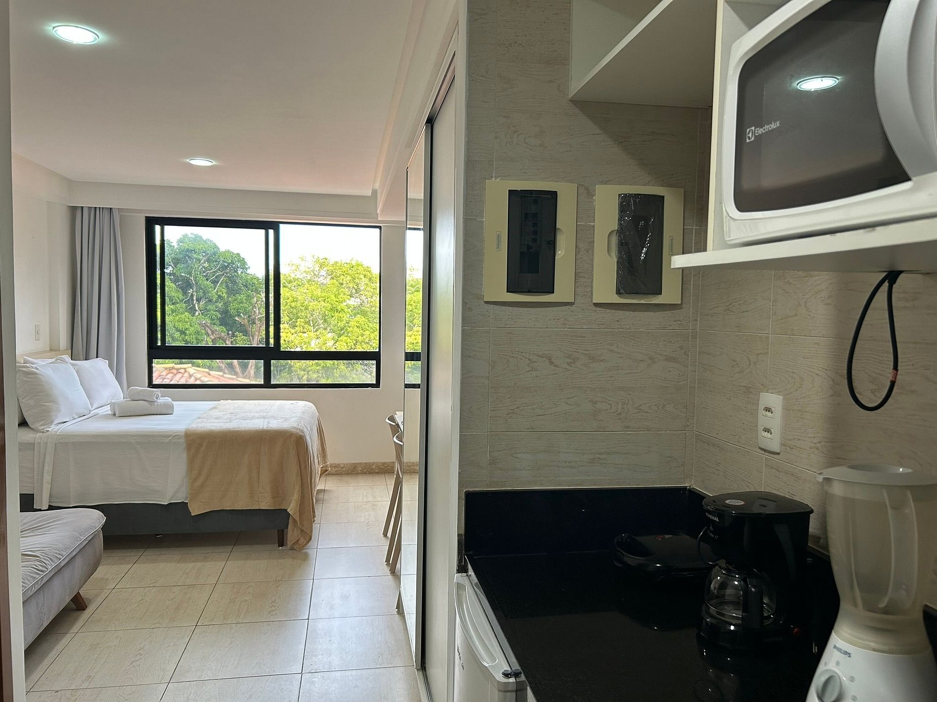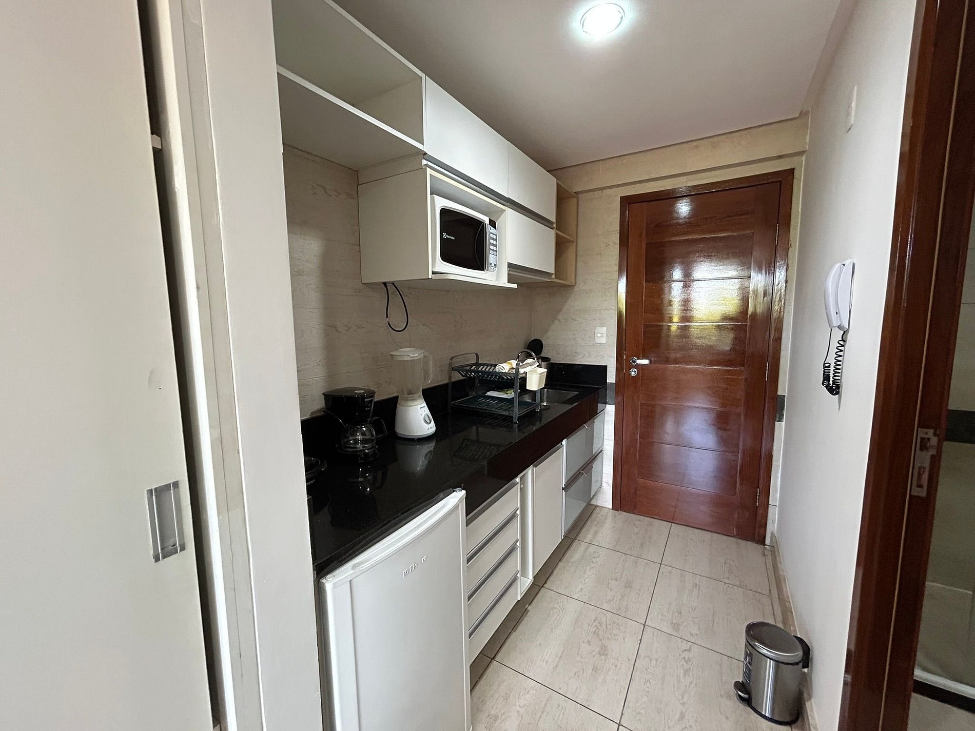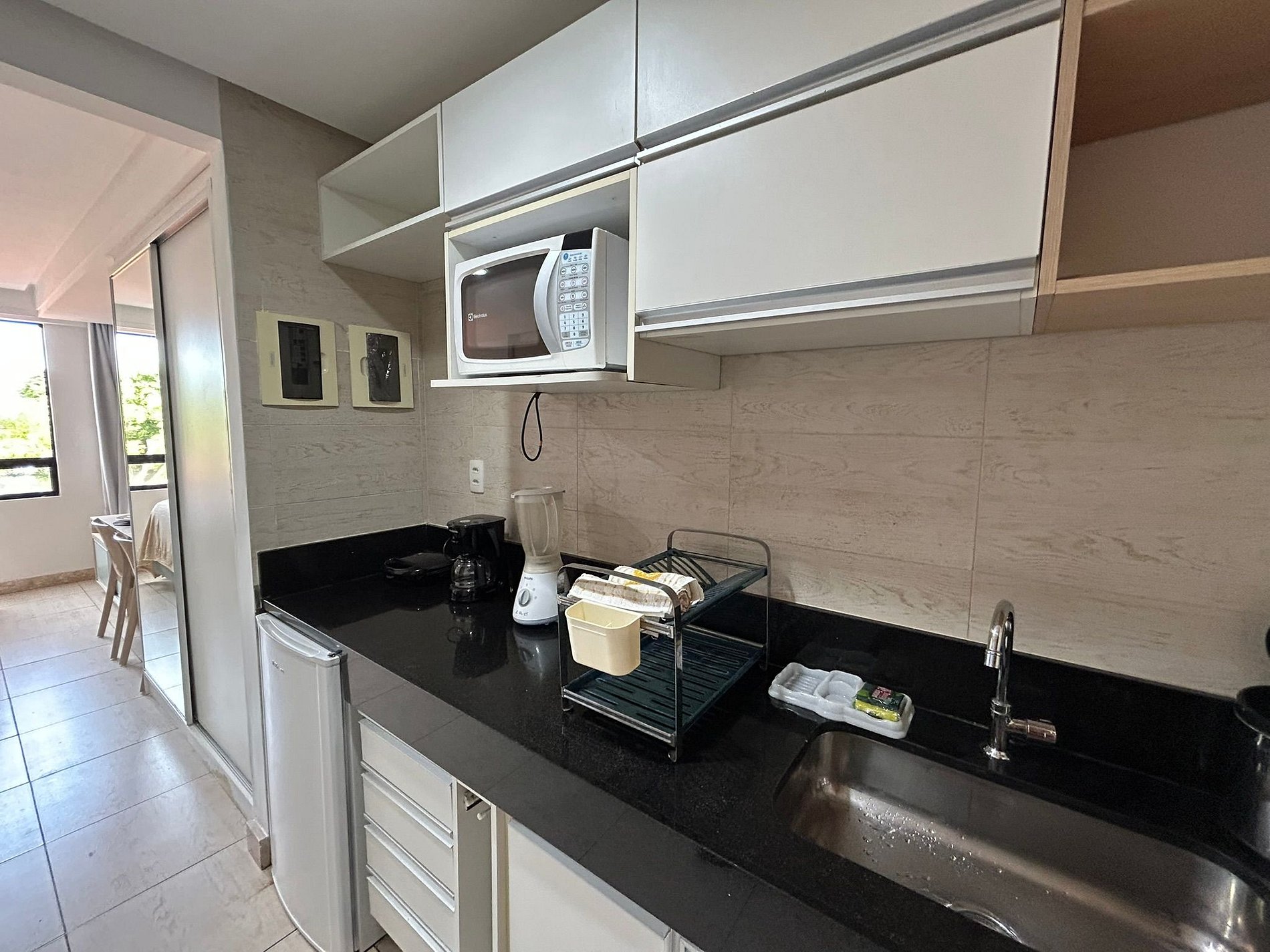 Possui cozinha compacta equipada com eletrodomésticos e utensílios básicos como frigobar, liquidificador, sanduicheira, cafeteira elétrica e microondas.
