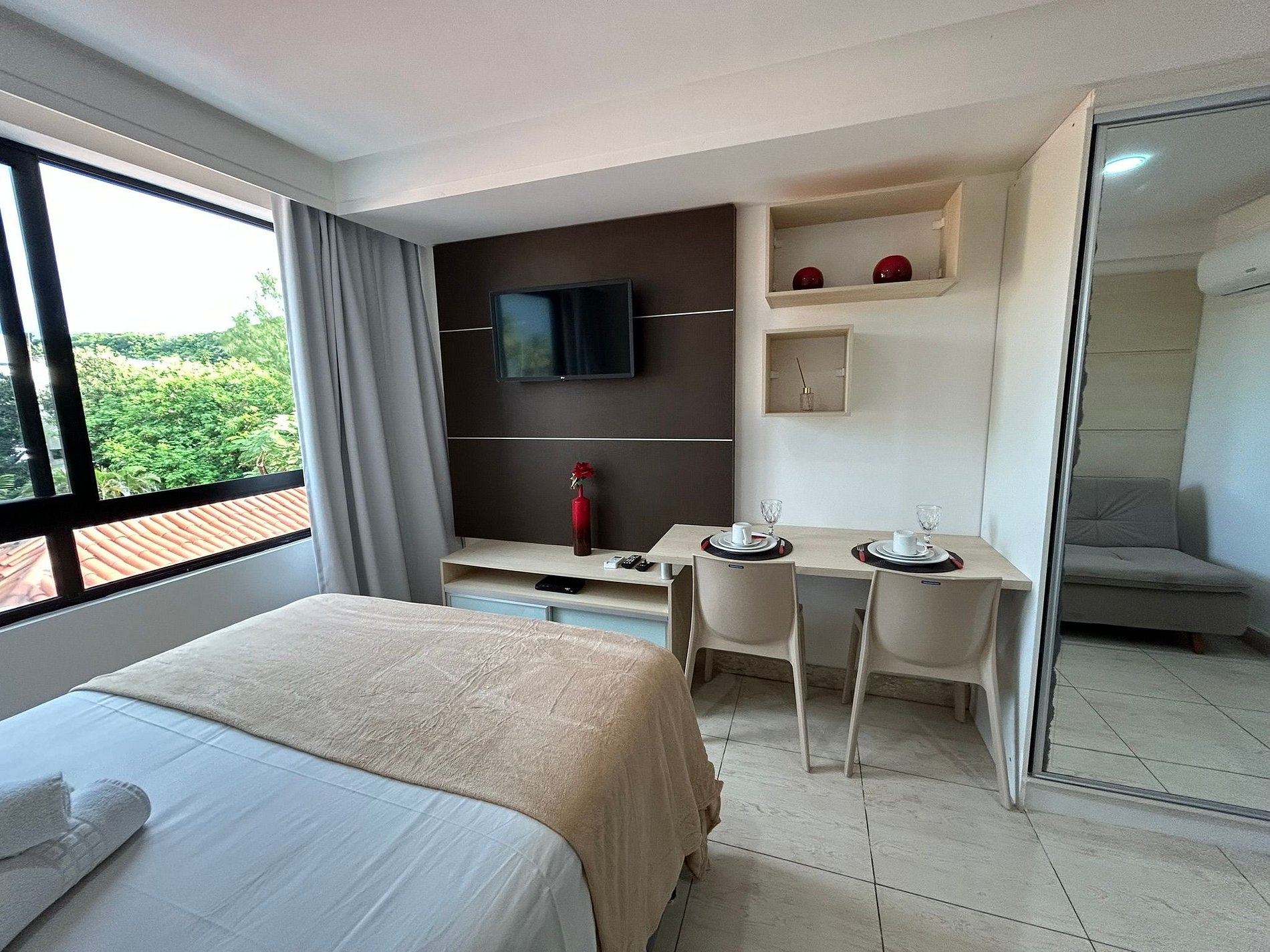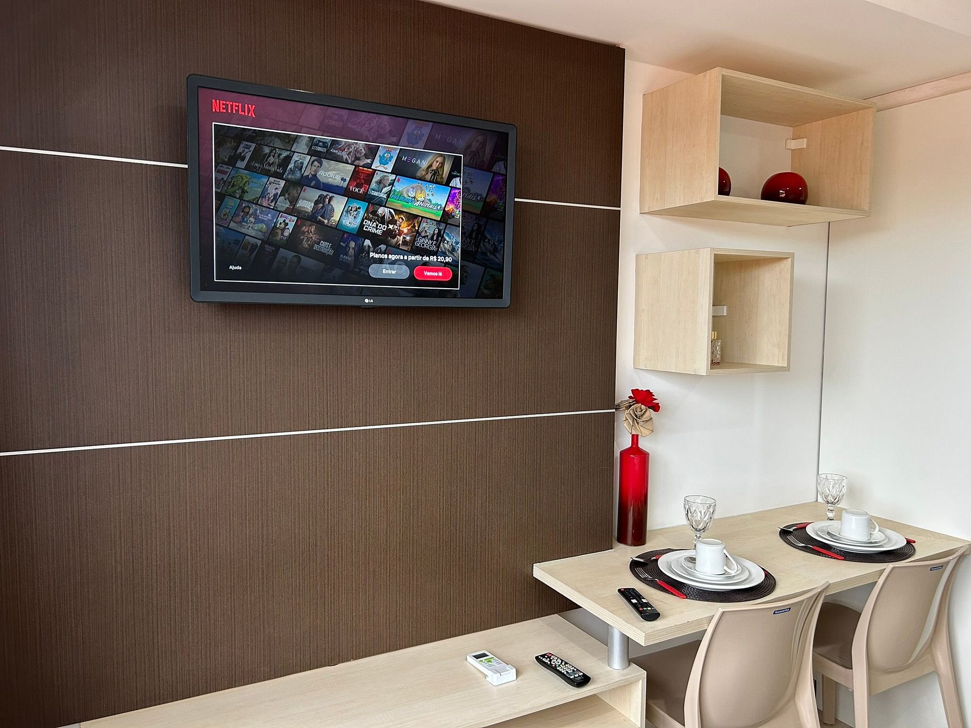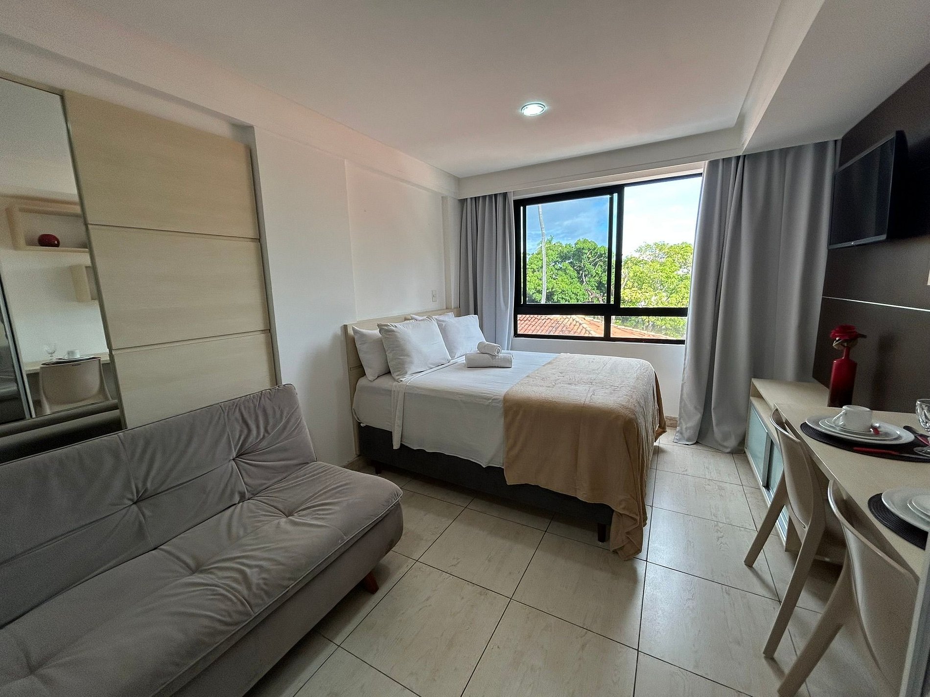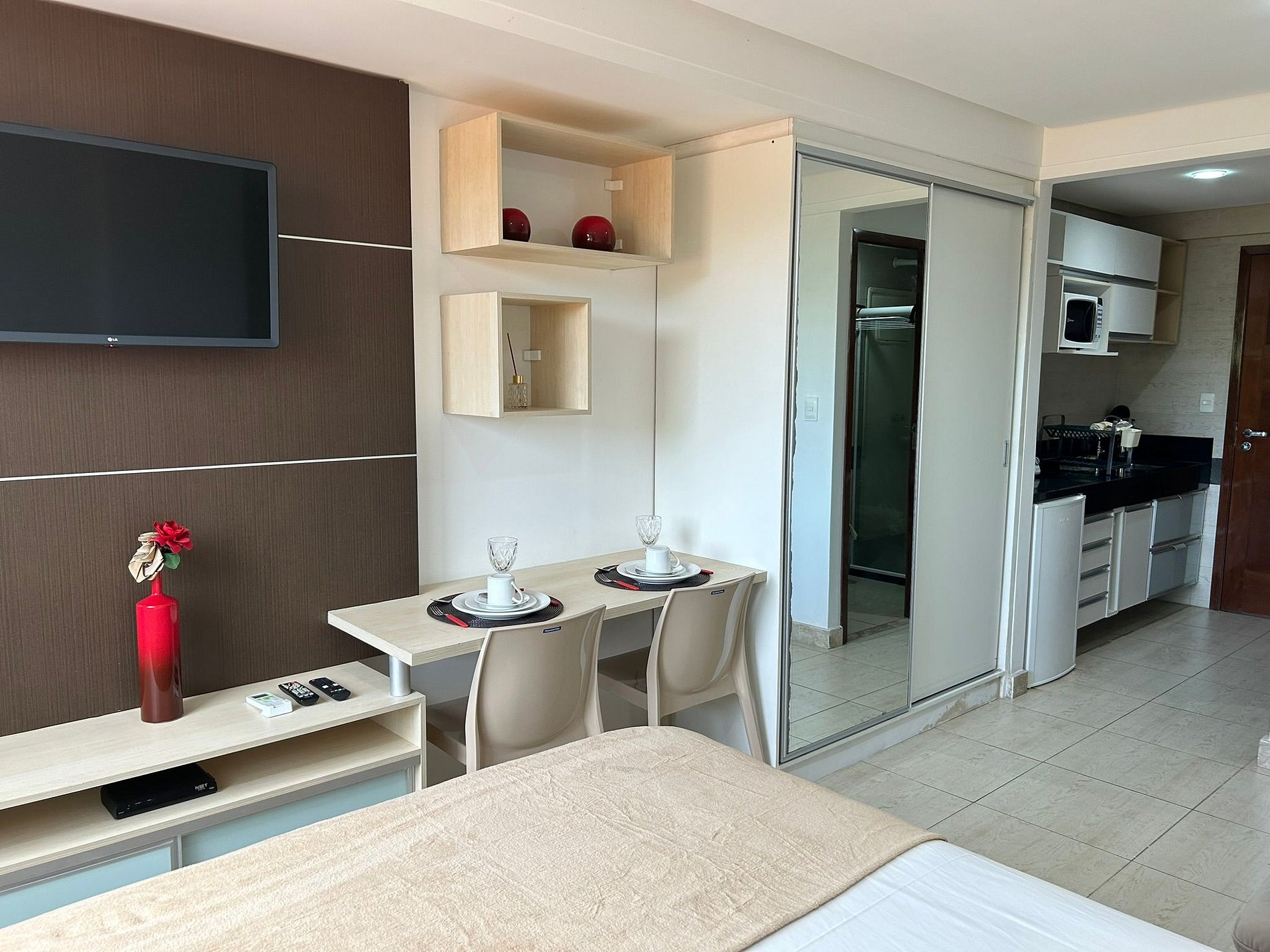 O flat é mobiliado, decorado e equipado com eletrodomésticos e utensílios para preparo de refeições, além de dispor de enxoval completo de lençóis, toalhas e travesseiros para a sua entrada.
